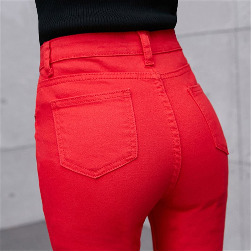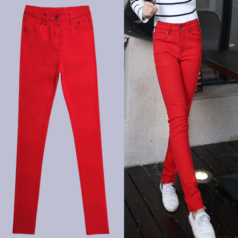红色牛仔裤女高腰秋冬修身显瘦小脚铅笔裤韩版休闲纯色大码长裤