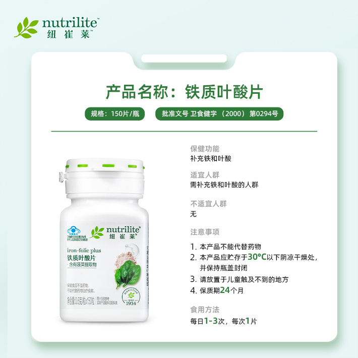 安利纽崔莱铁质叶酸片150片男女士备怀孕期补铁维生素