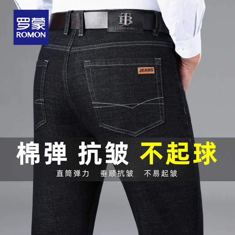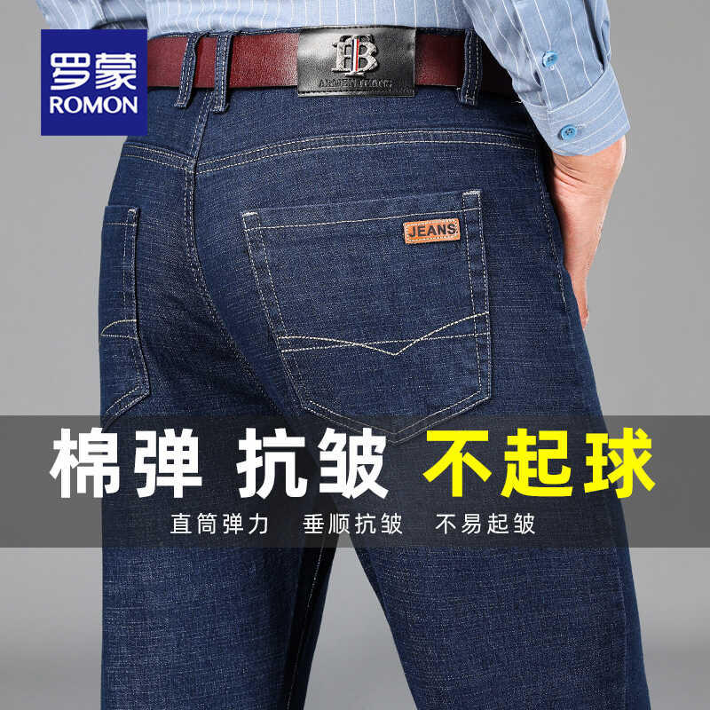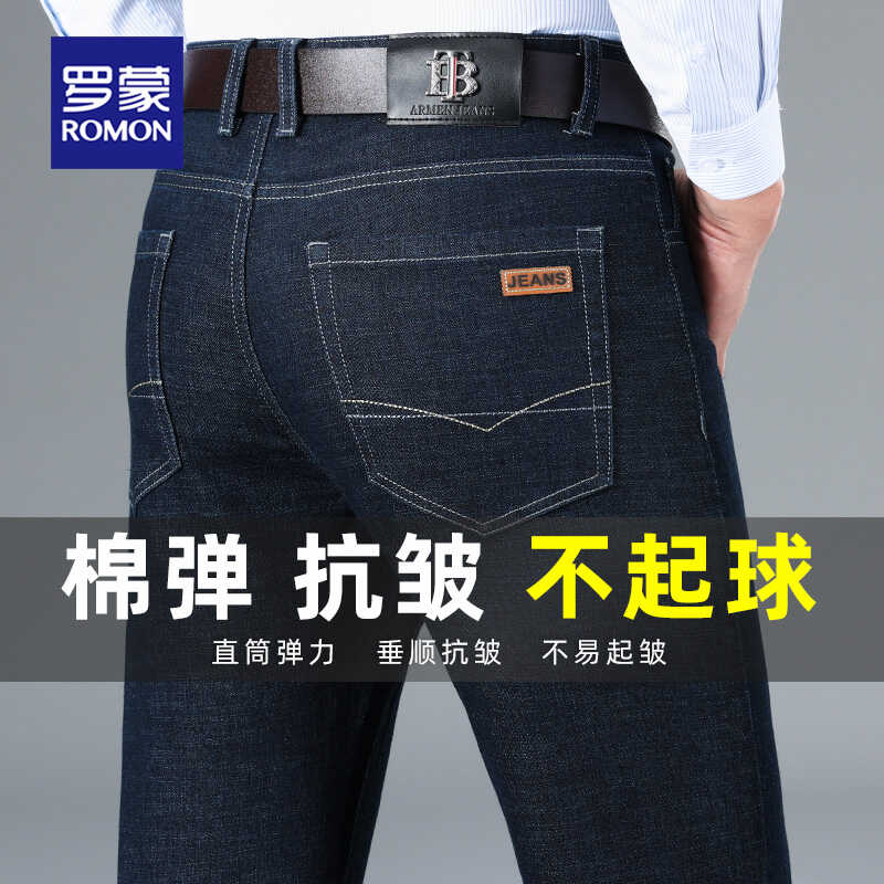 罗蒙男士牛仔裤秋季厚款中年休闲冬季长裤男直筒高腰爸爸弹力长裤
