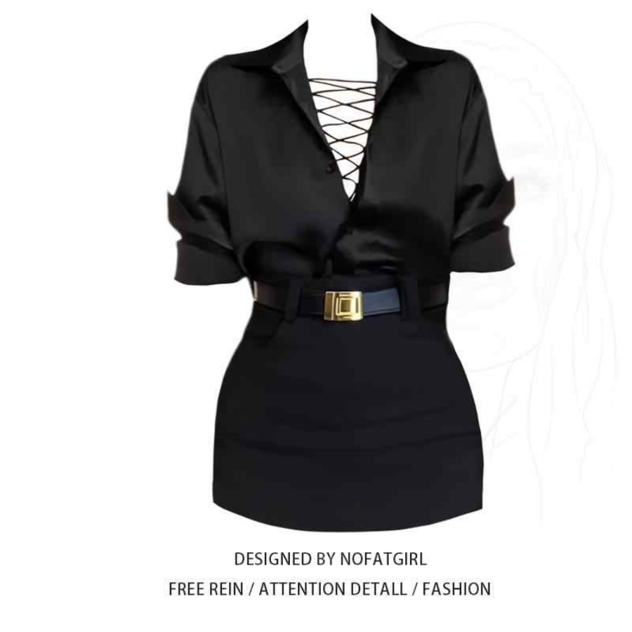 大码胖MM今年流行时尚套装法式设计感V领气质衬衫包臀裙两件套女