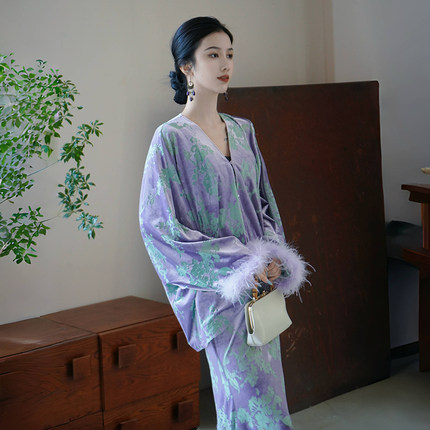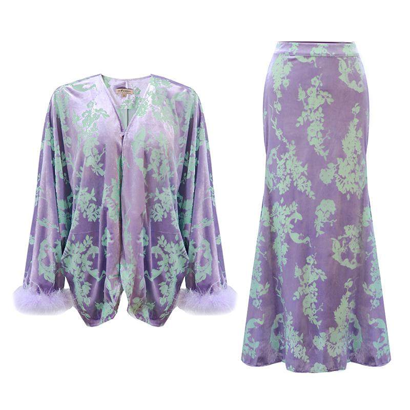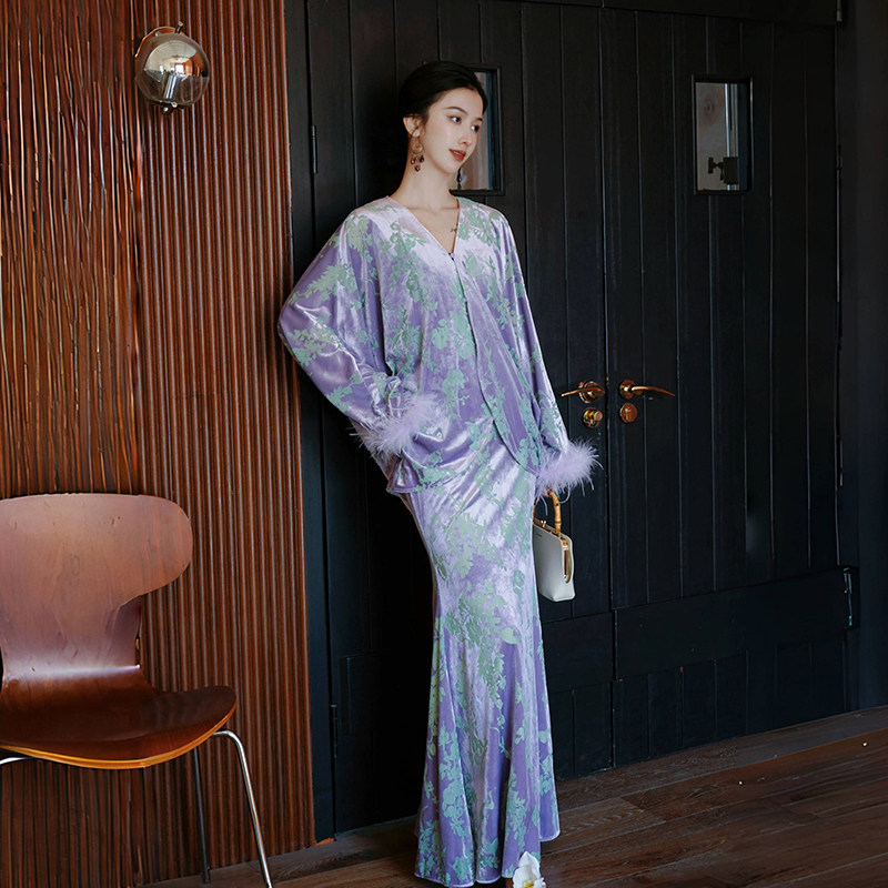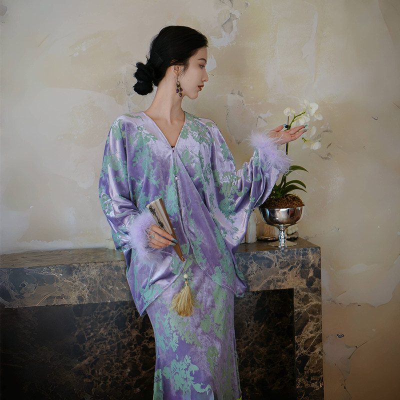 澄渔高定【藤兰紫宛】新中式烧花金钻绒鸵鸟毛上衣鱼尾半裙套装