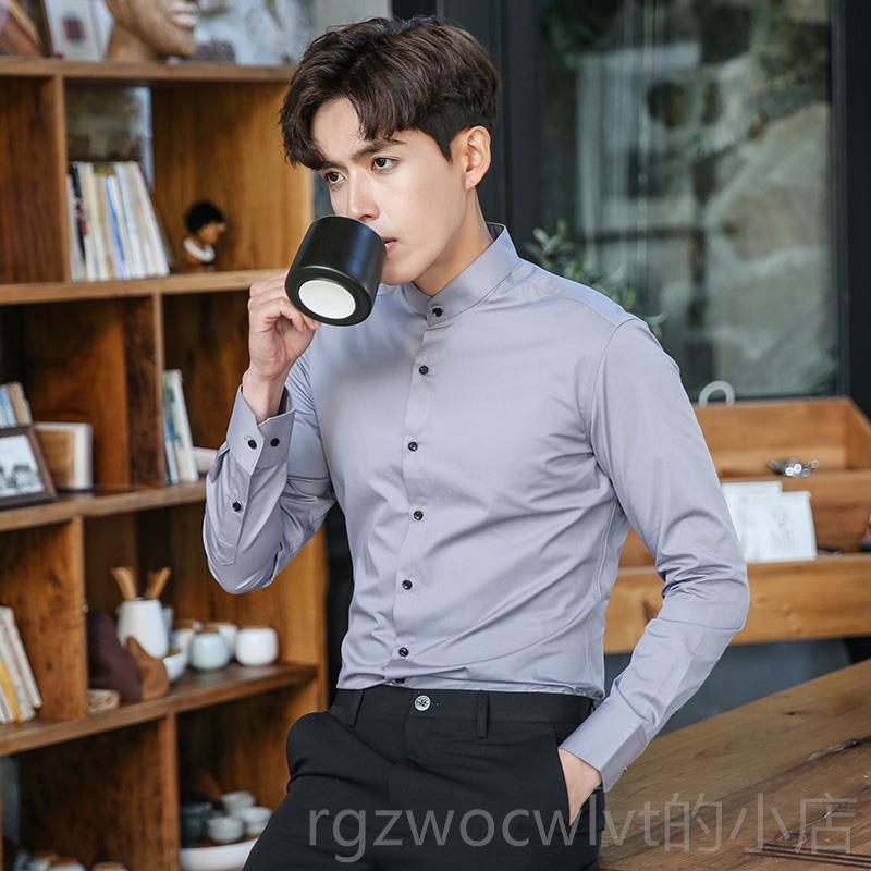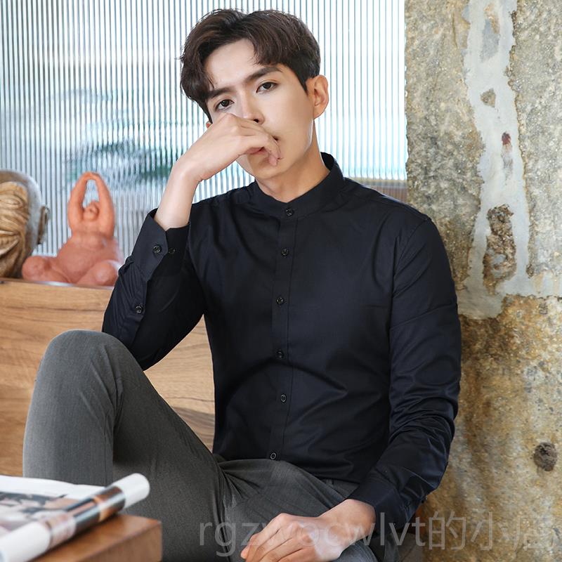 新款立领白衬衫男长袖季中式商秋正务职业装黑色工装工圆领作服衬