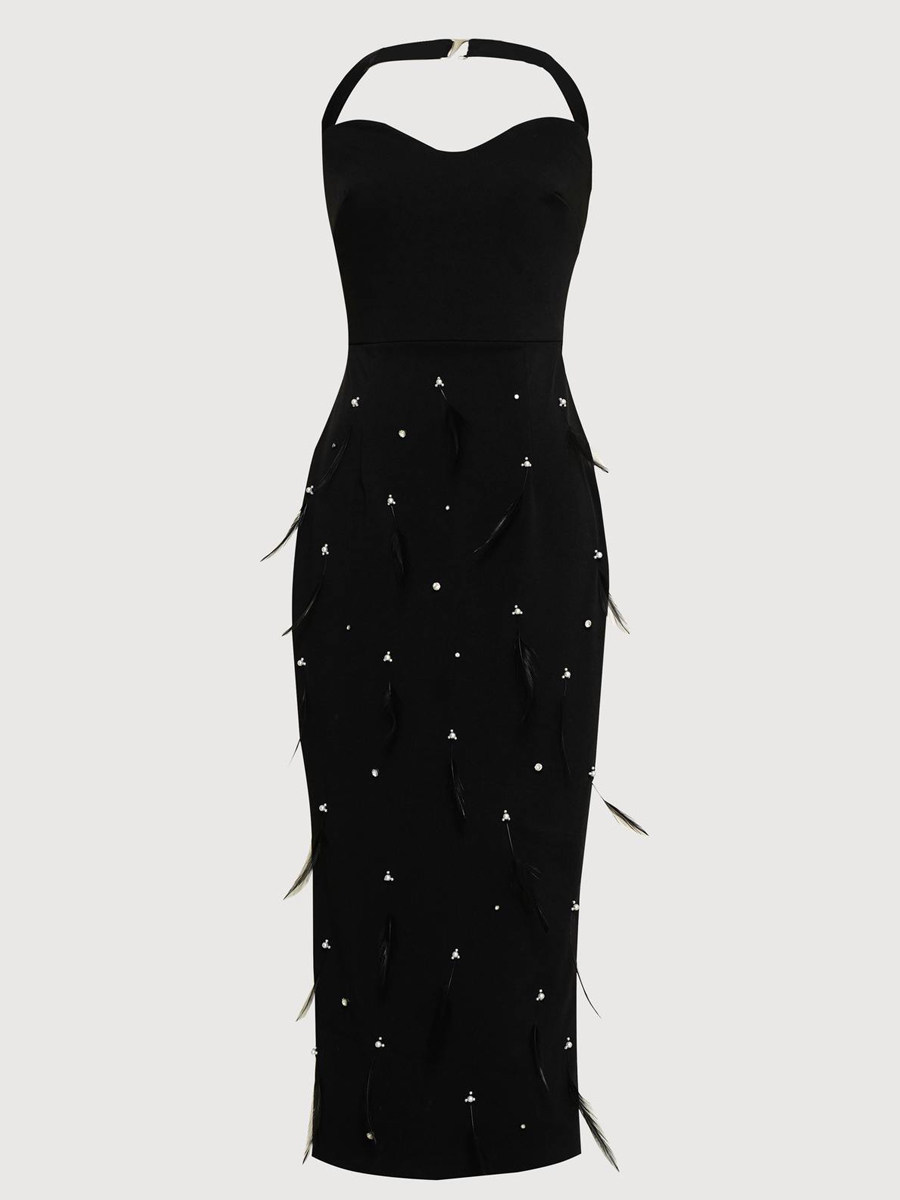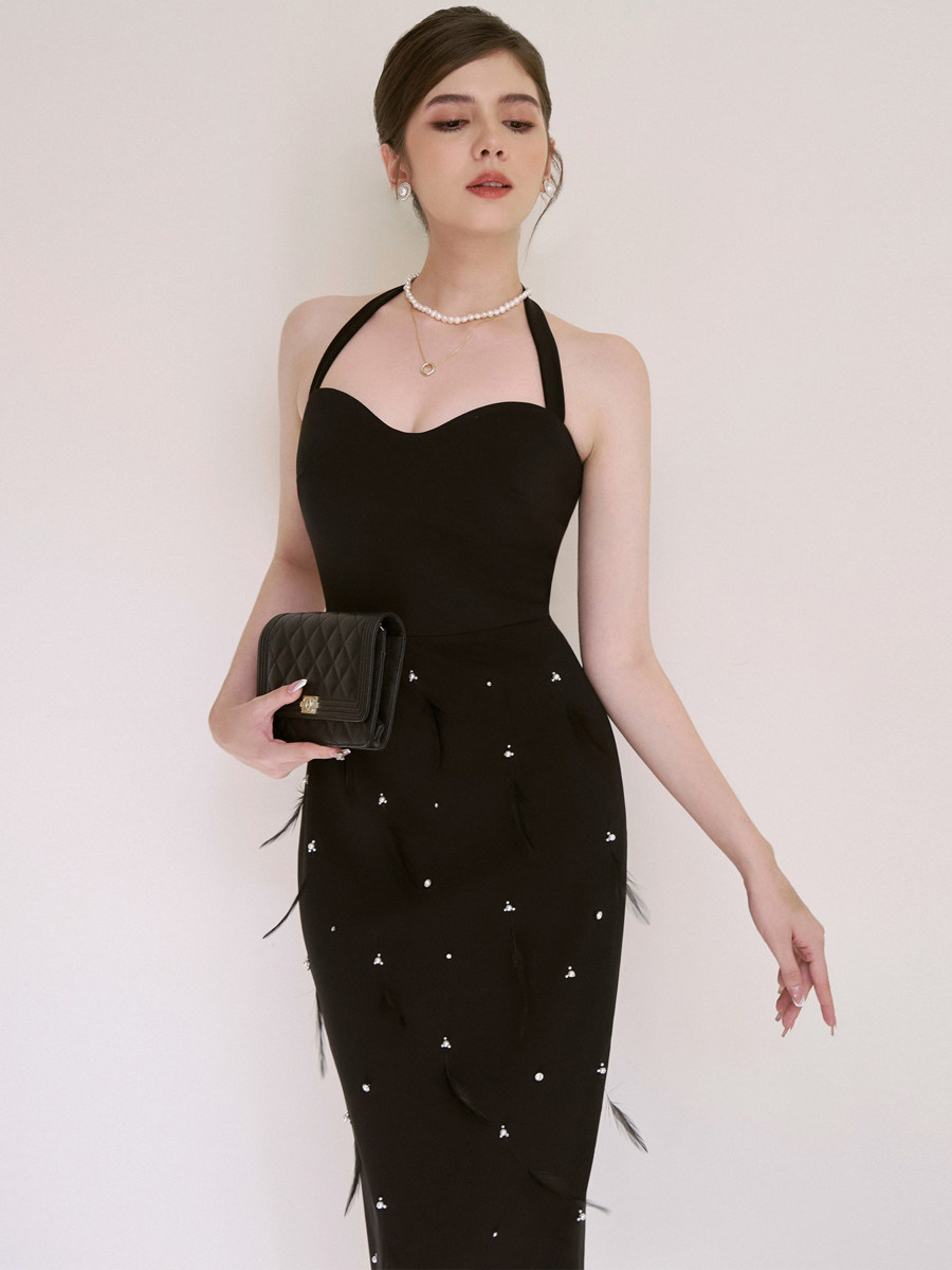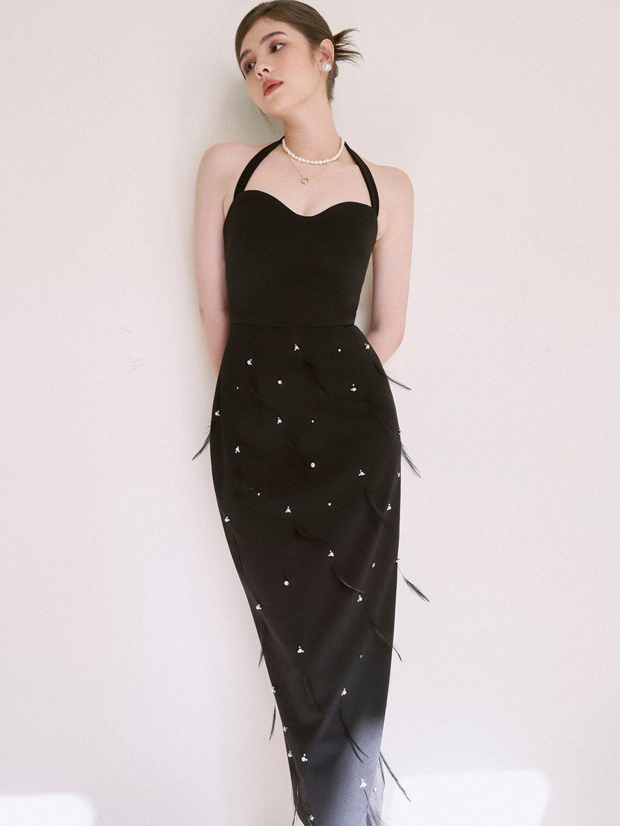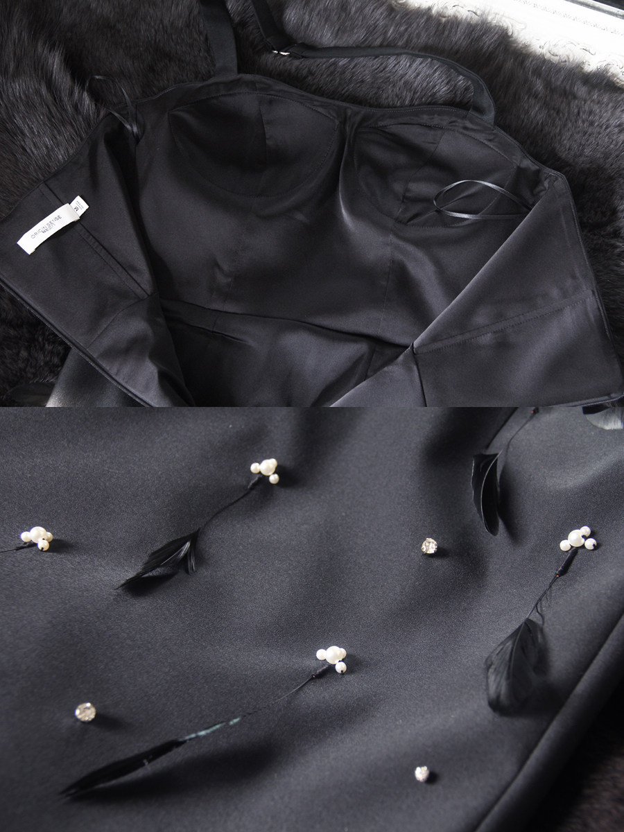 高档纯手工重工钉珠鸵鸟毛装饰精品挂脖黑色精致抹胸气质小礼服