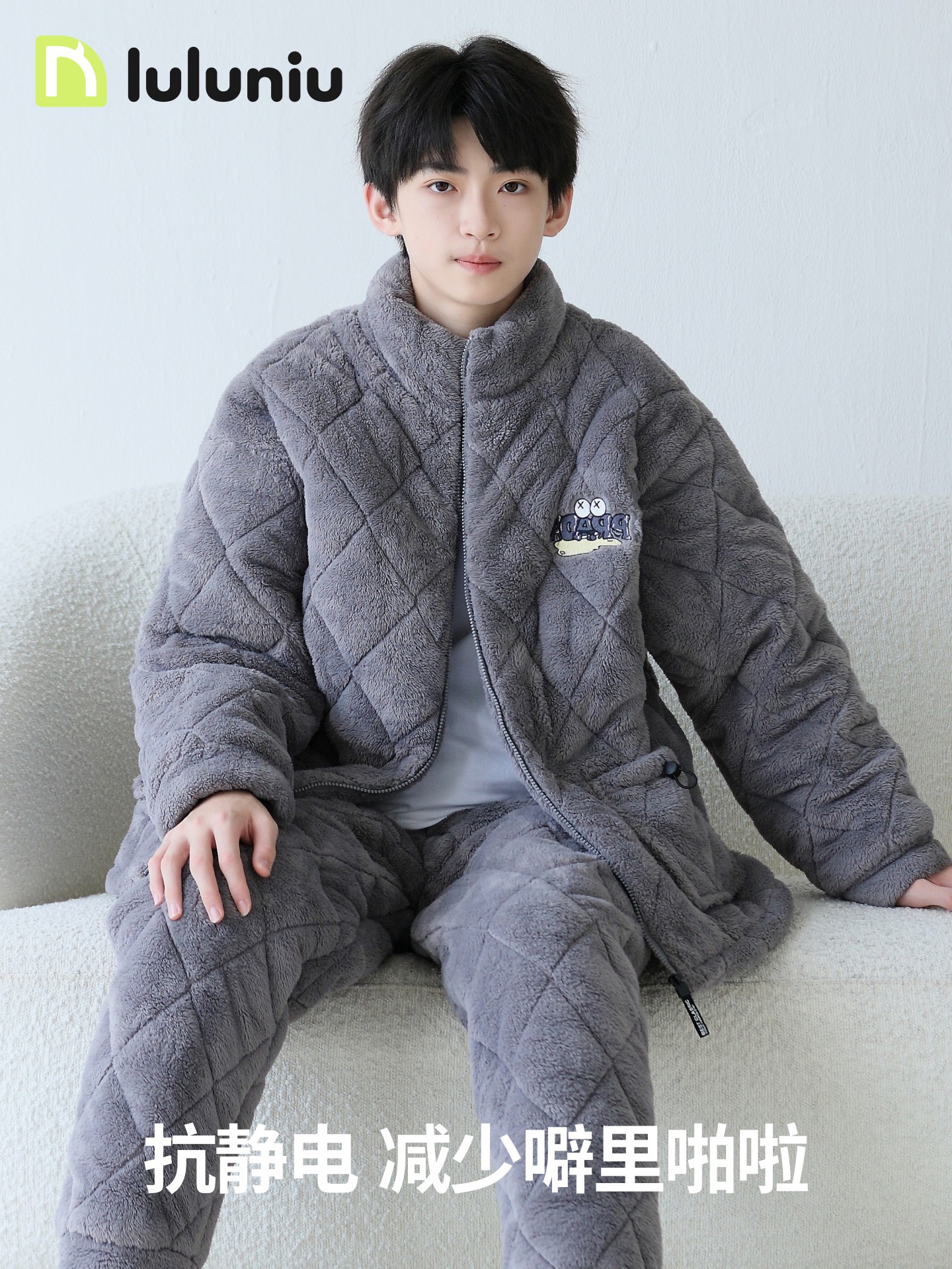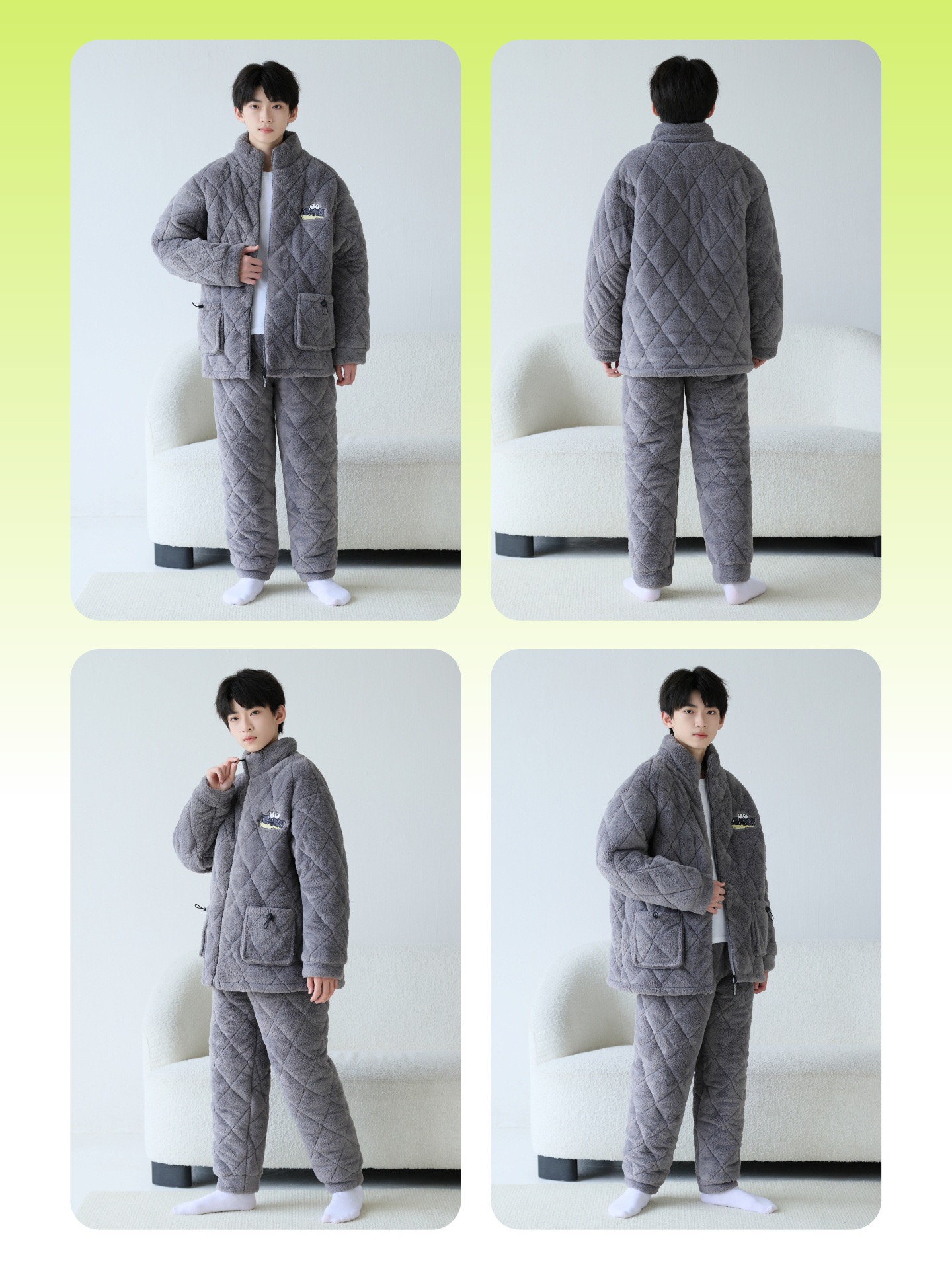 噜噜牛儿童睡衣男童冬季加厚法兰绒三层夹棉男孩大童青少年家居服