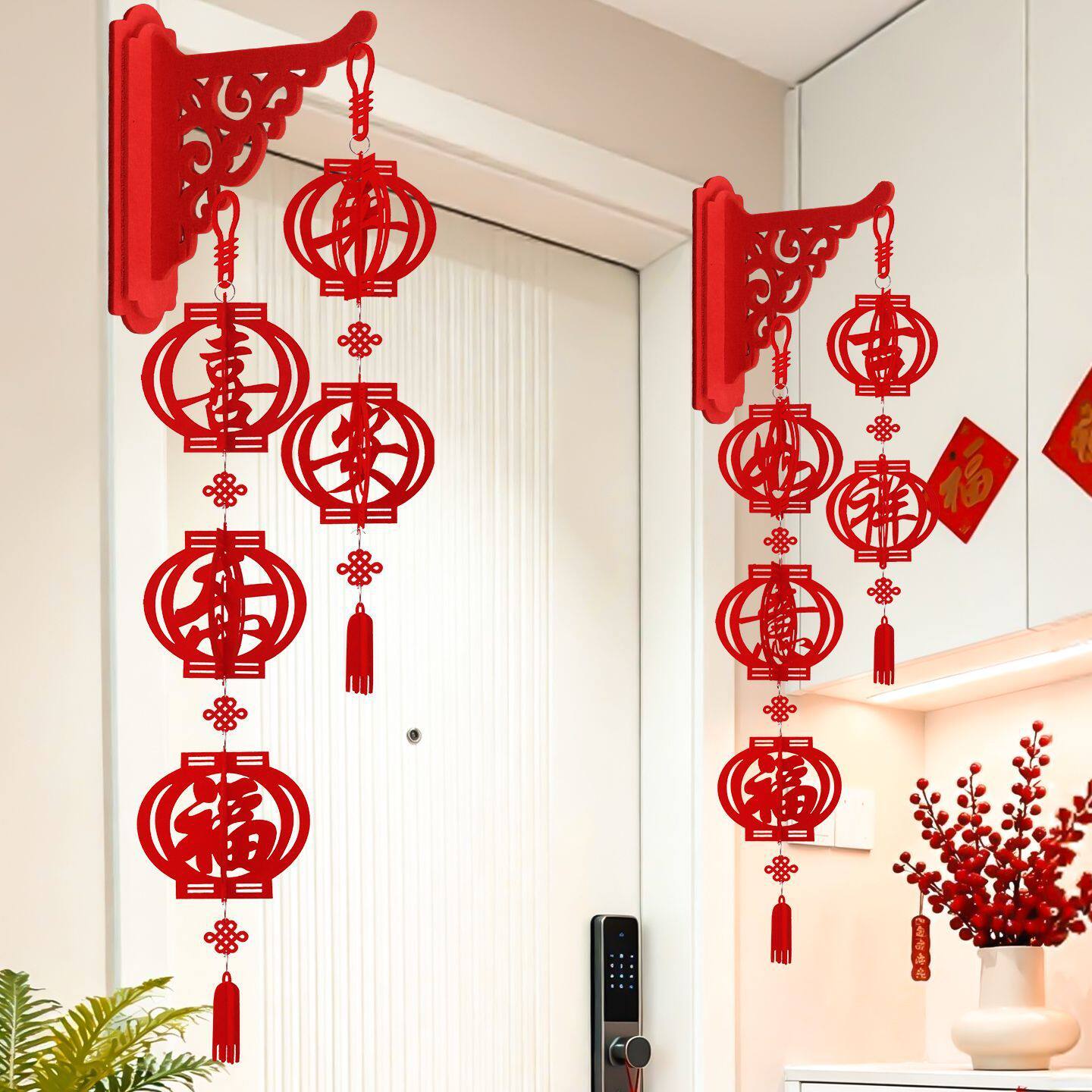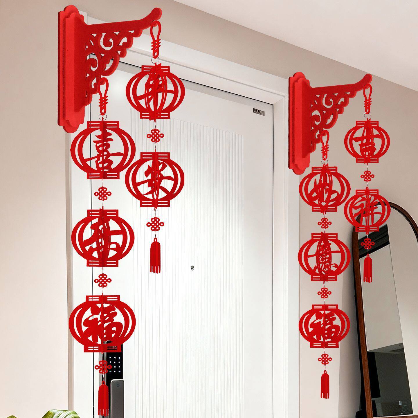 立体福字搭配镂空灯笼设计,挂在门框、玄关处,家里年味满满