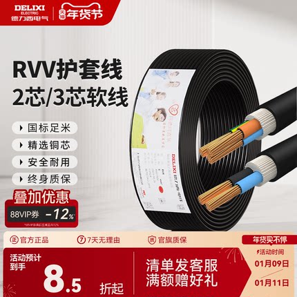 德力西RVV黑色电线软线电缆线2芯3芯1.5 2.5 4平方电缆线护套线