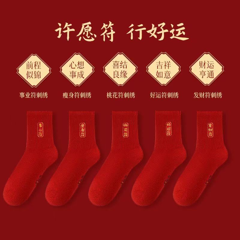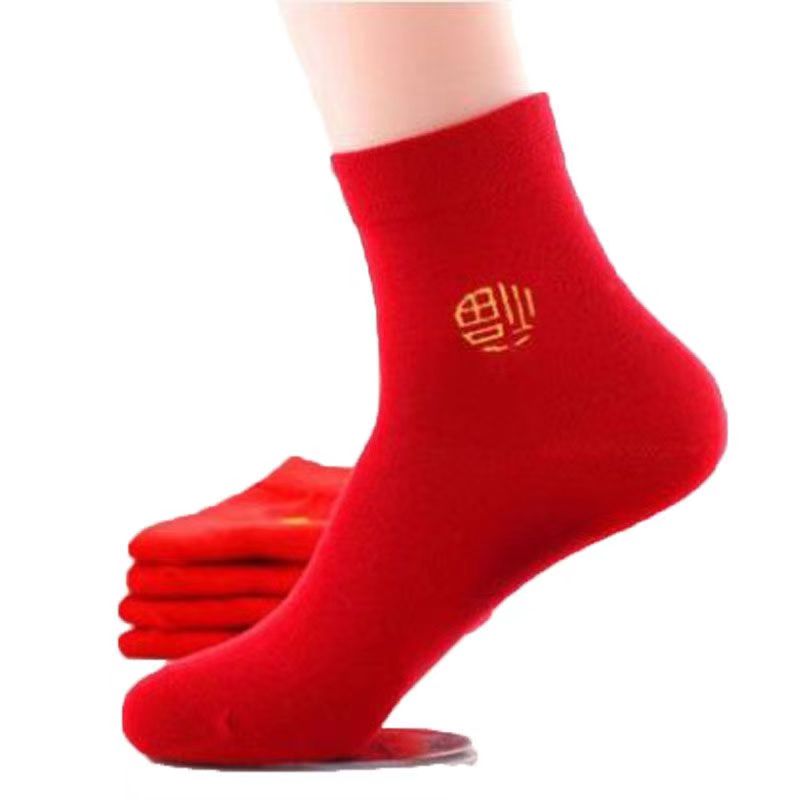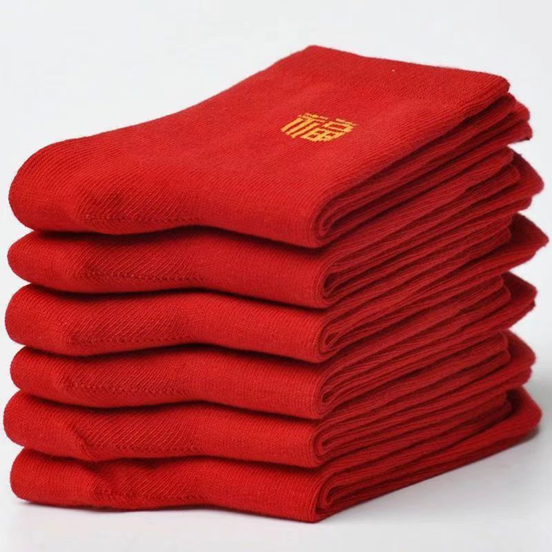本命年喜庆红袜子男女情侣龙年婚庆秋冬红色袜子大红福字中筒长袜
