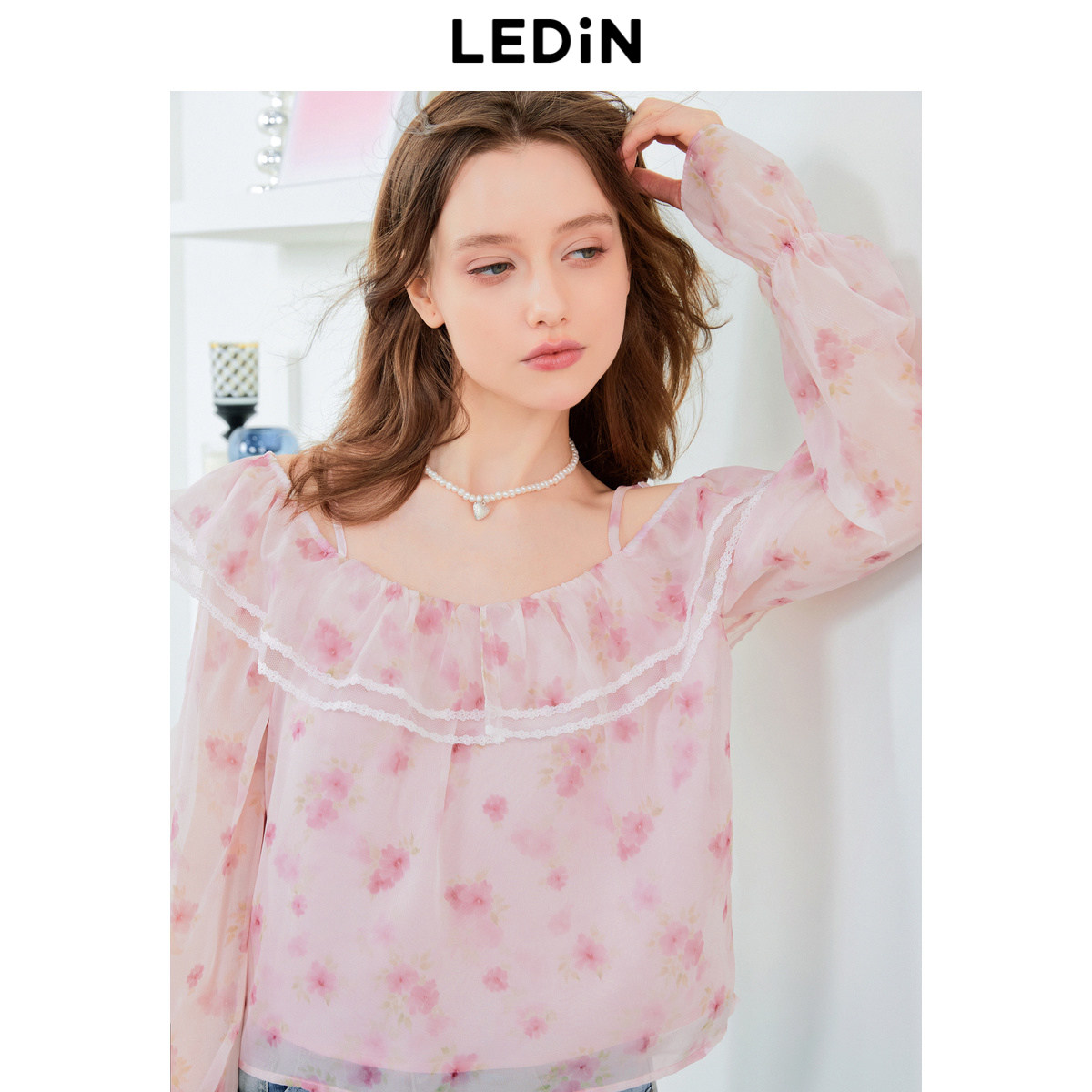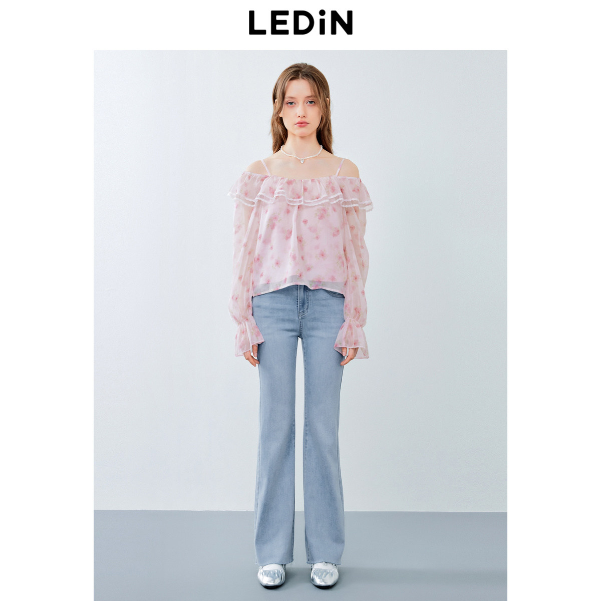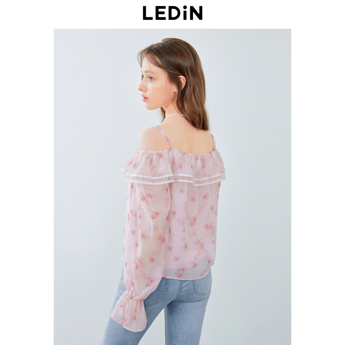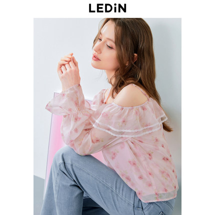 乐町浪漫一字领雪纺衫夏季新款女士性感露肩高腰显瘦上衣