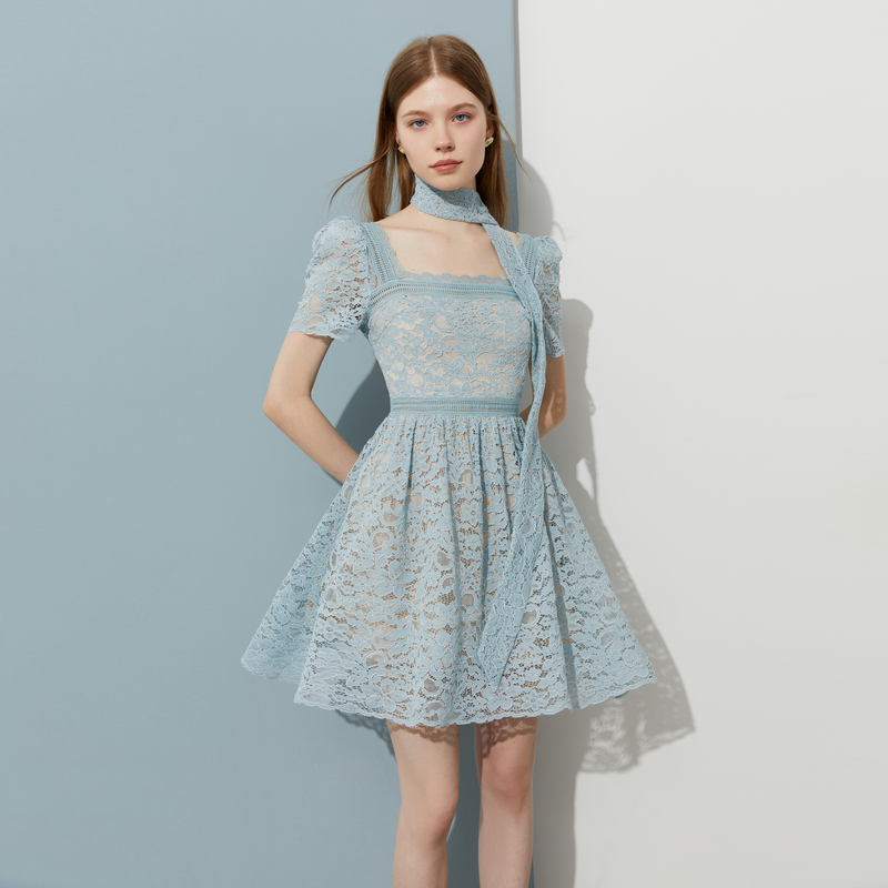 DPLAY【黑标】2025年夏季新款蓝色连衣裙女复古别致短款蕾丝短裙