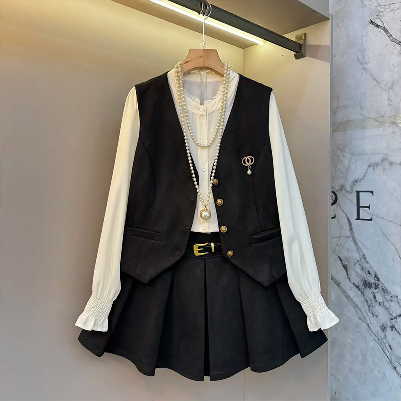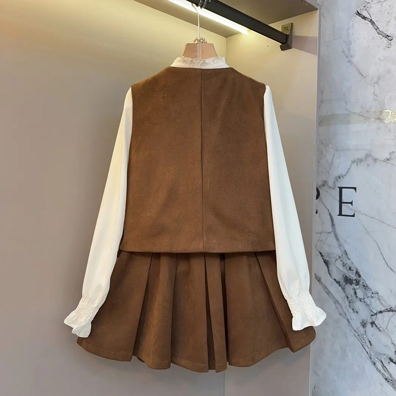 大码女装V领马甲腰带百褶短裙减龄两件套胖妹妹荷叶立领长袖衬衫