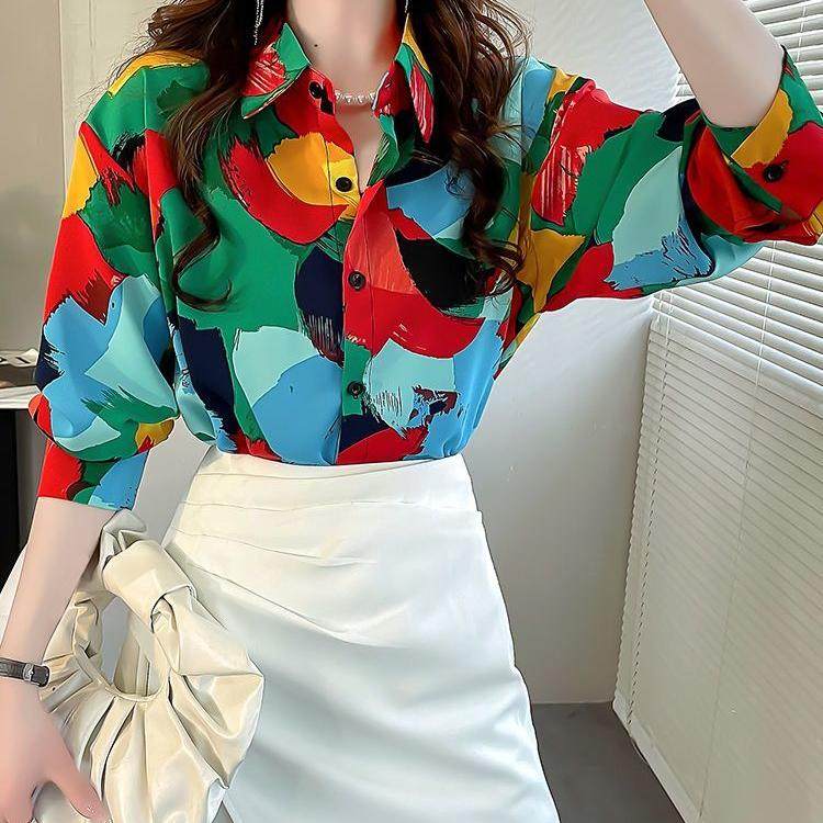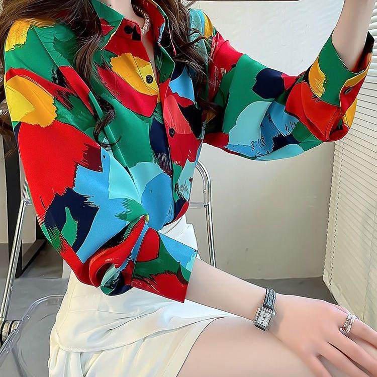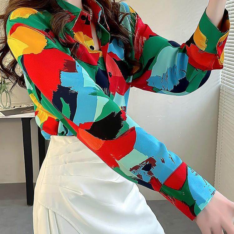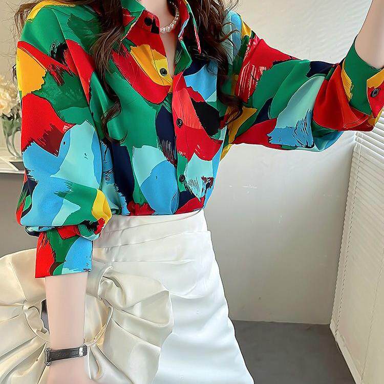 清仓捡漏专柜撤回早春衬衣长袖上衣印花衬衫女大码宽松雪纺衫女潮