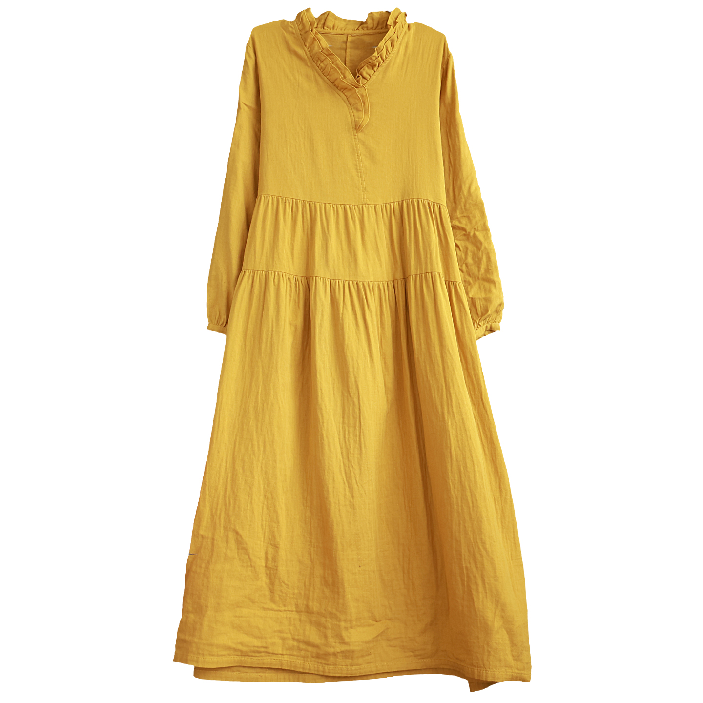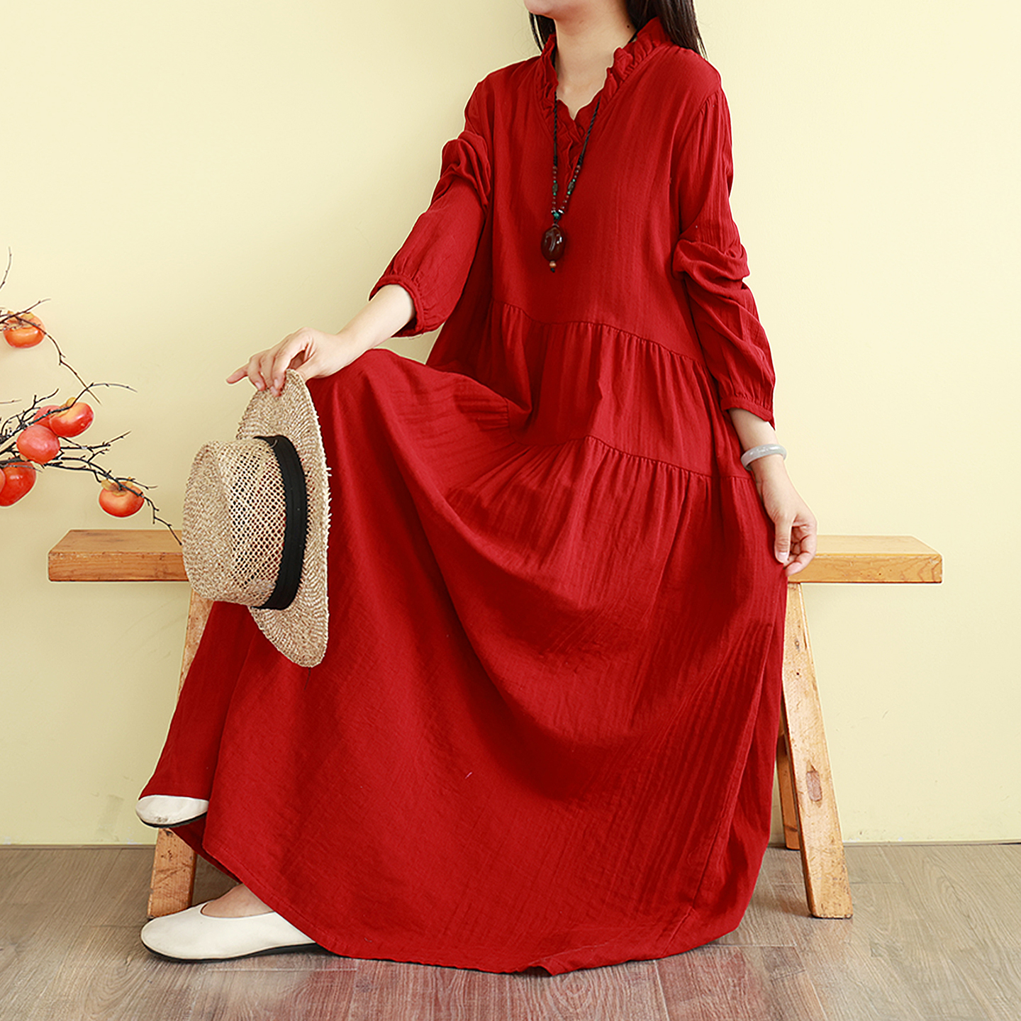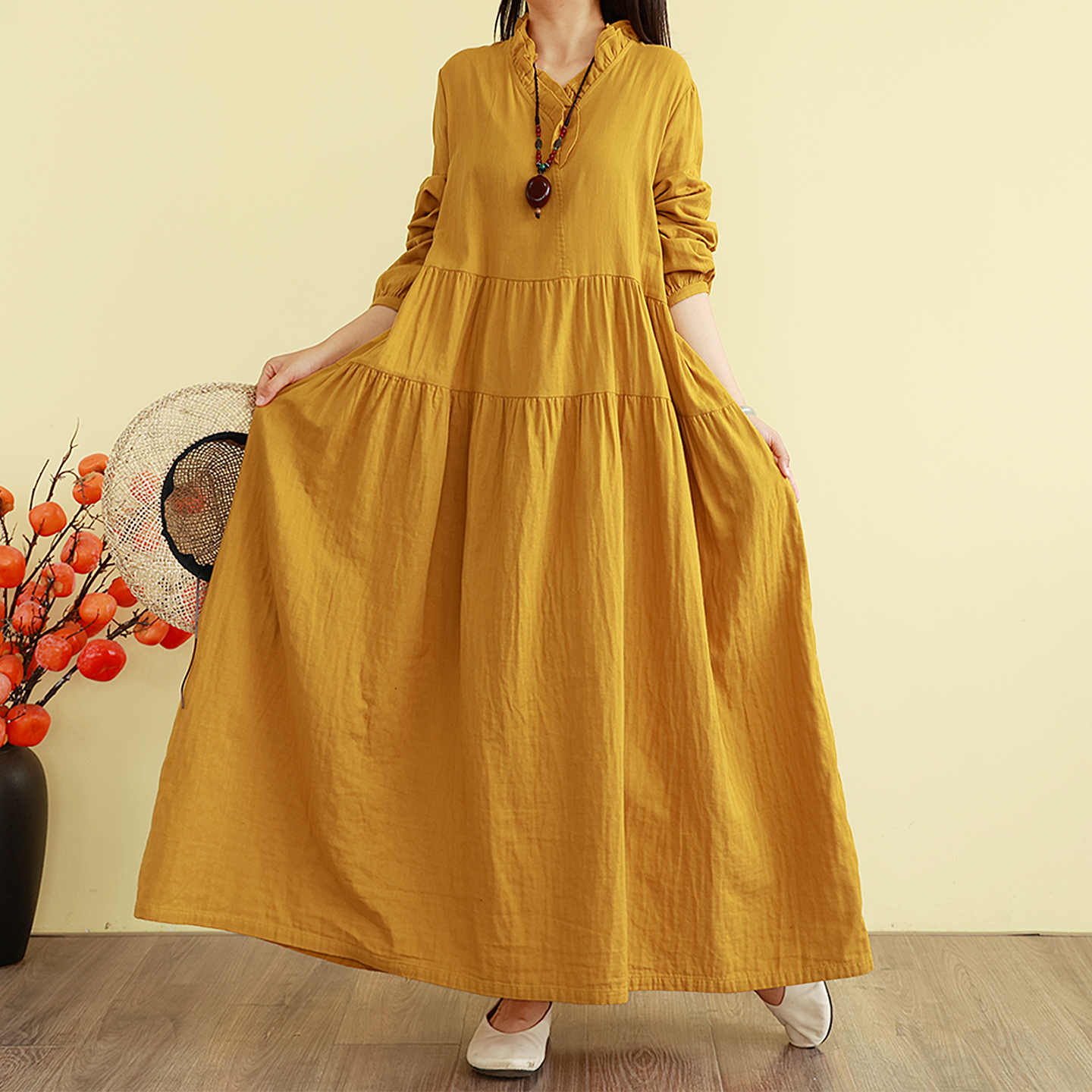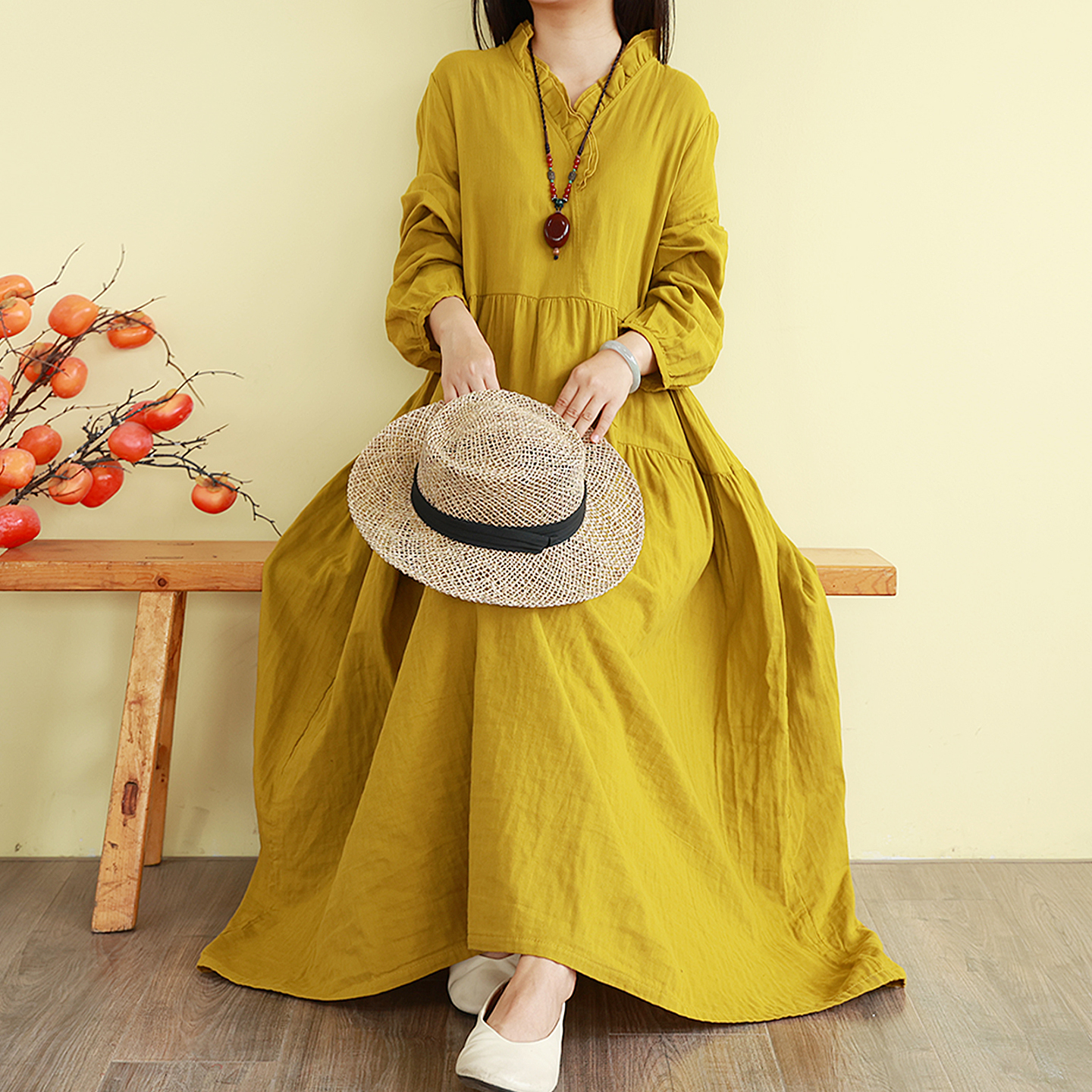 复古文艺棉麻连衣裙秋季长款过膝大摆气质麻料长裙子宽松森系纯色