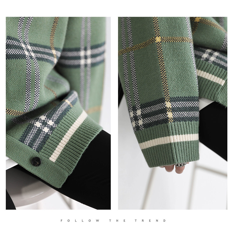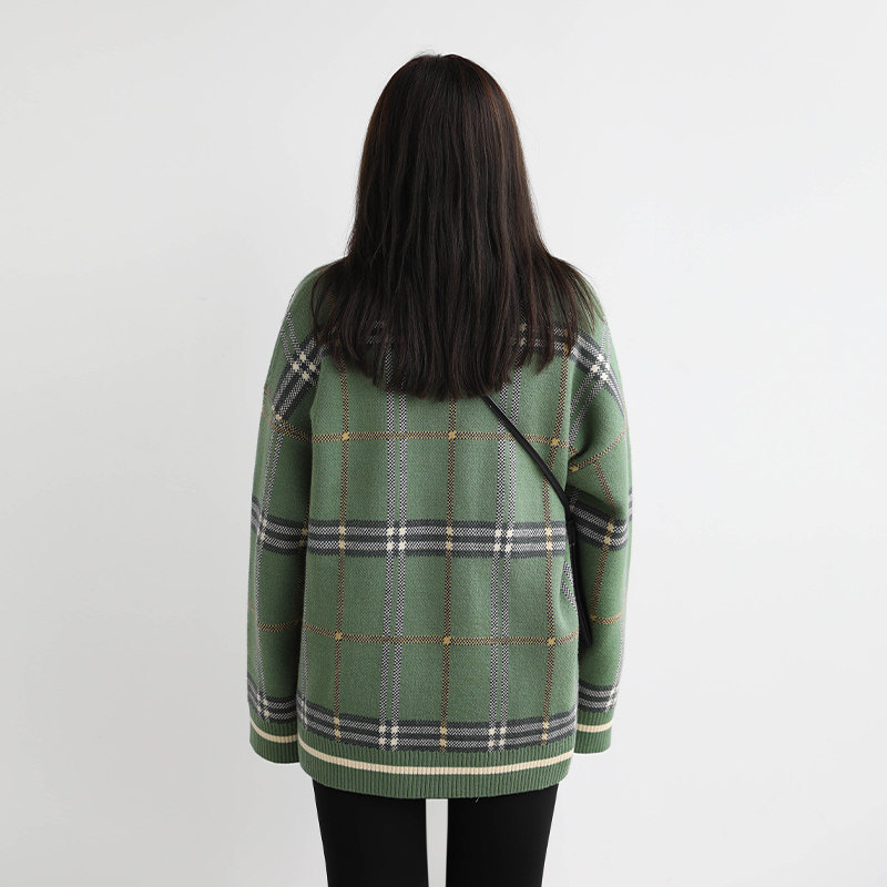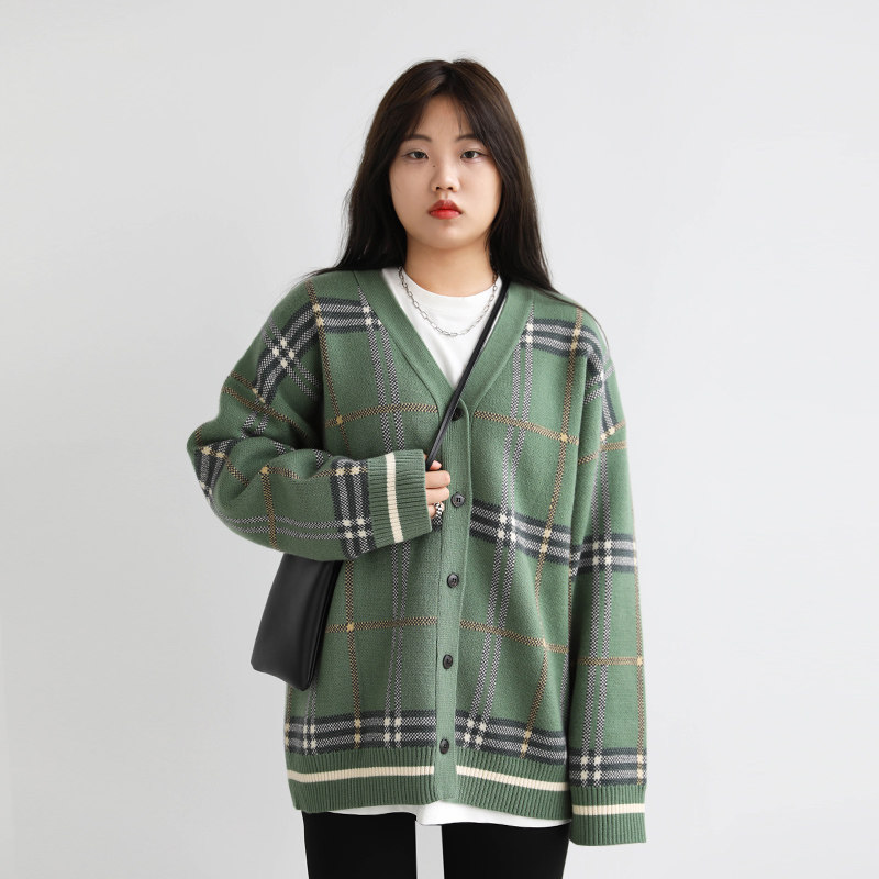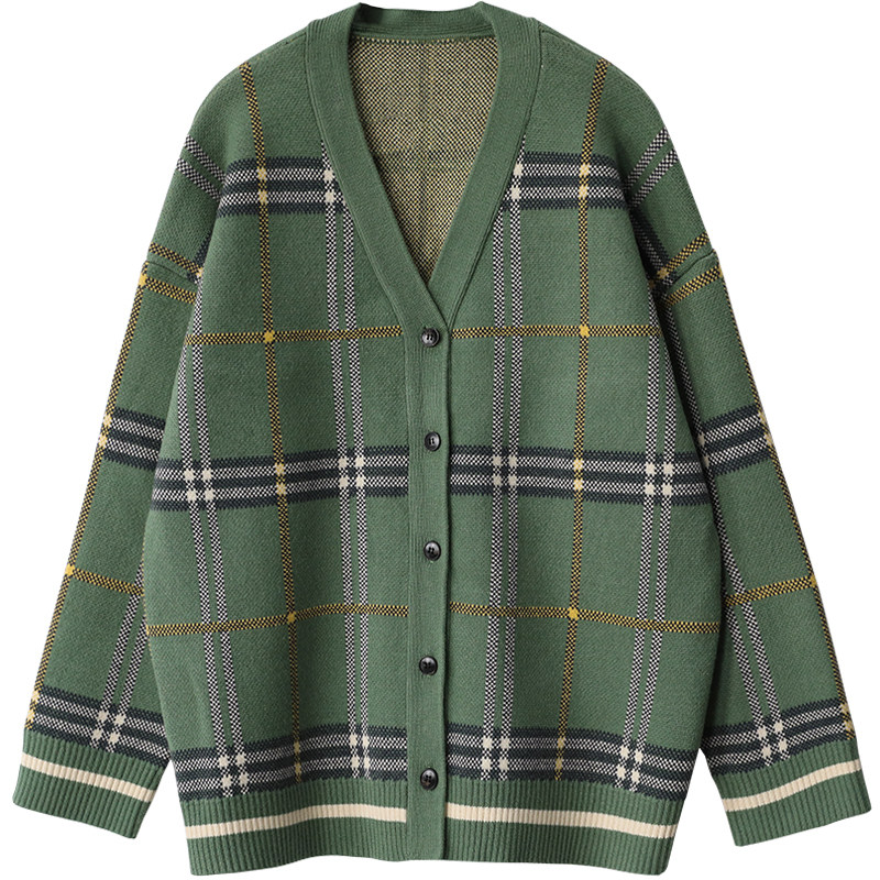 CV大码女装 原创复古宽松V领格纹长袖针织开衫毛衣外套女秋中长款