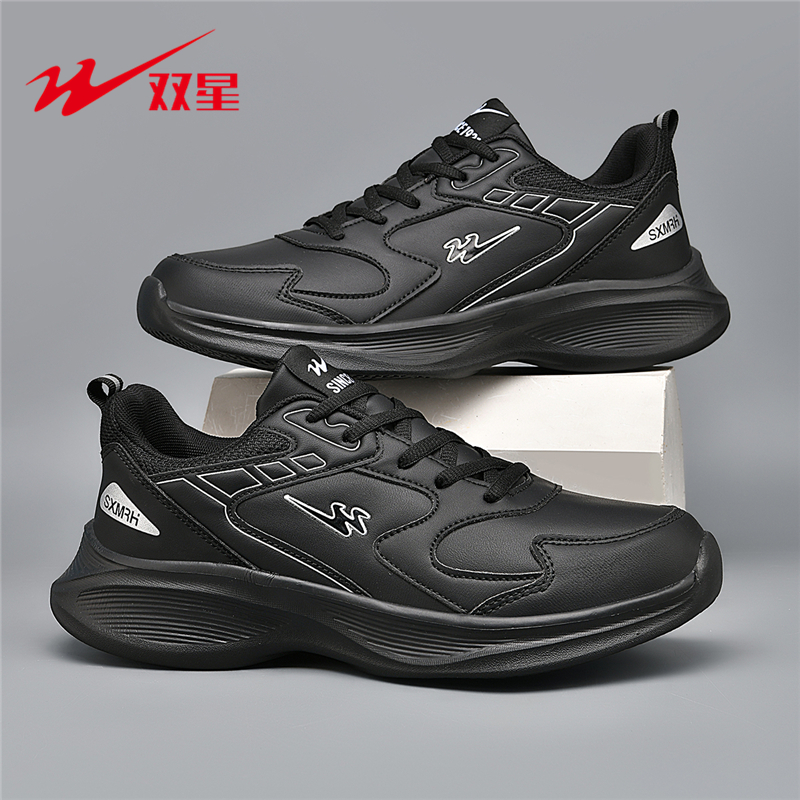 双星男鞋防水皮面黑色运动鞋男女2025秋季新款情侣休闲减震跑步鞋