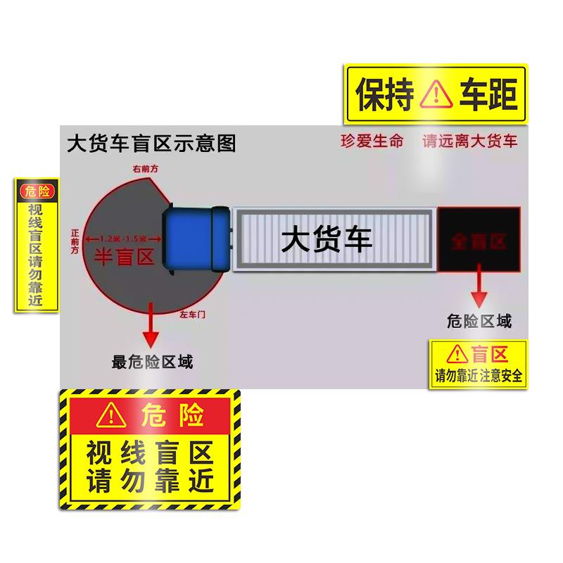 此处视线盲区请勿靠近反光警示标识驾校大货车卡车客车挖掘机谨防追尾保持车距贴纸严禁超载车贴条提示牌定制