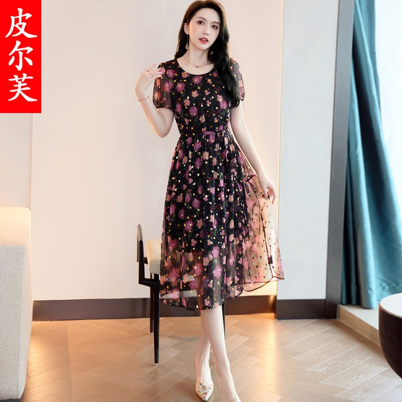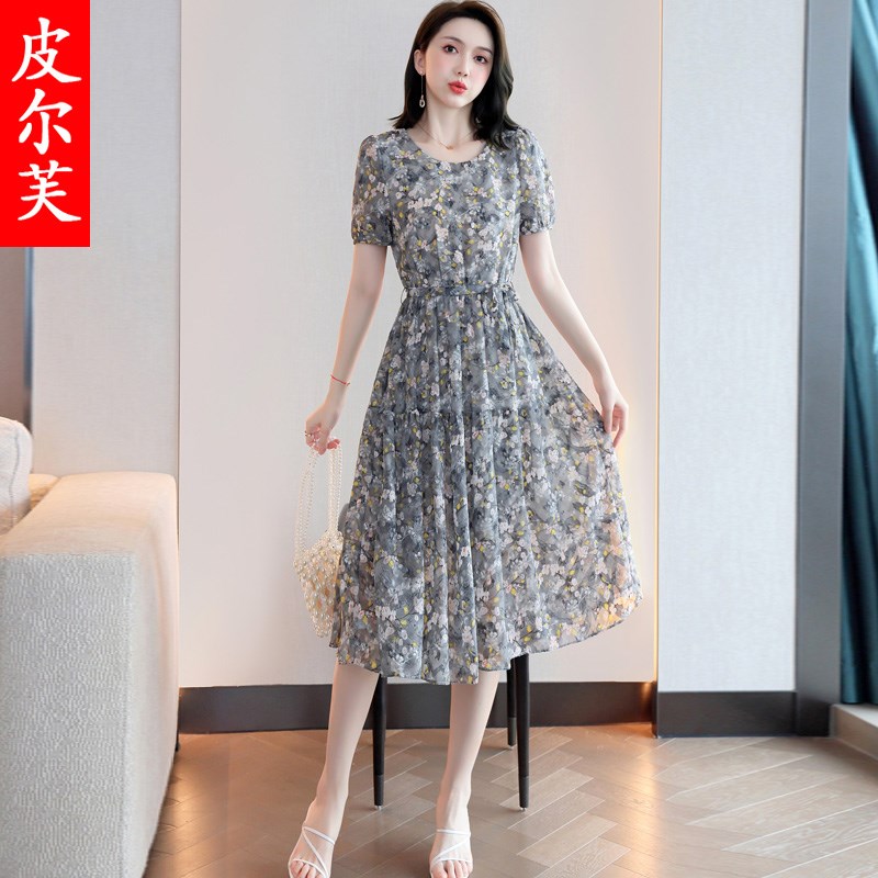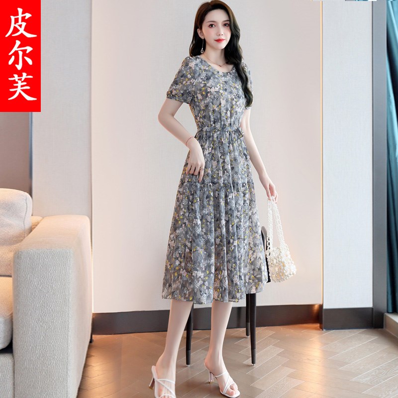 气质优雅雪纺碎花连衣裙女中长款2024年夏季新款洋气减龄收腰裙子
