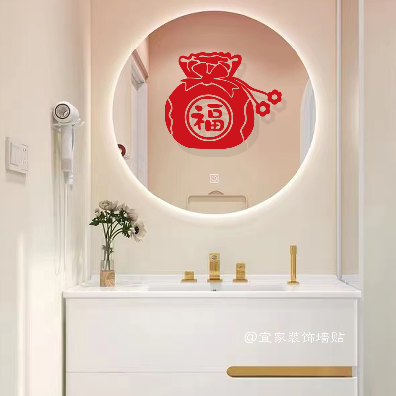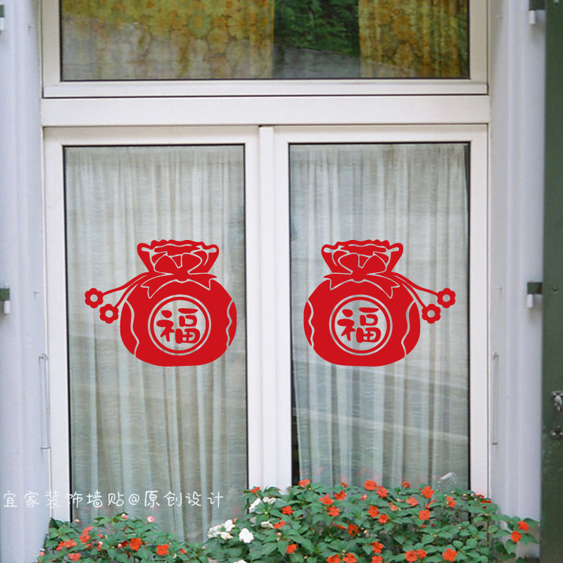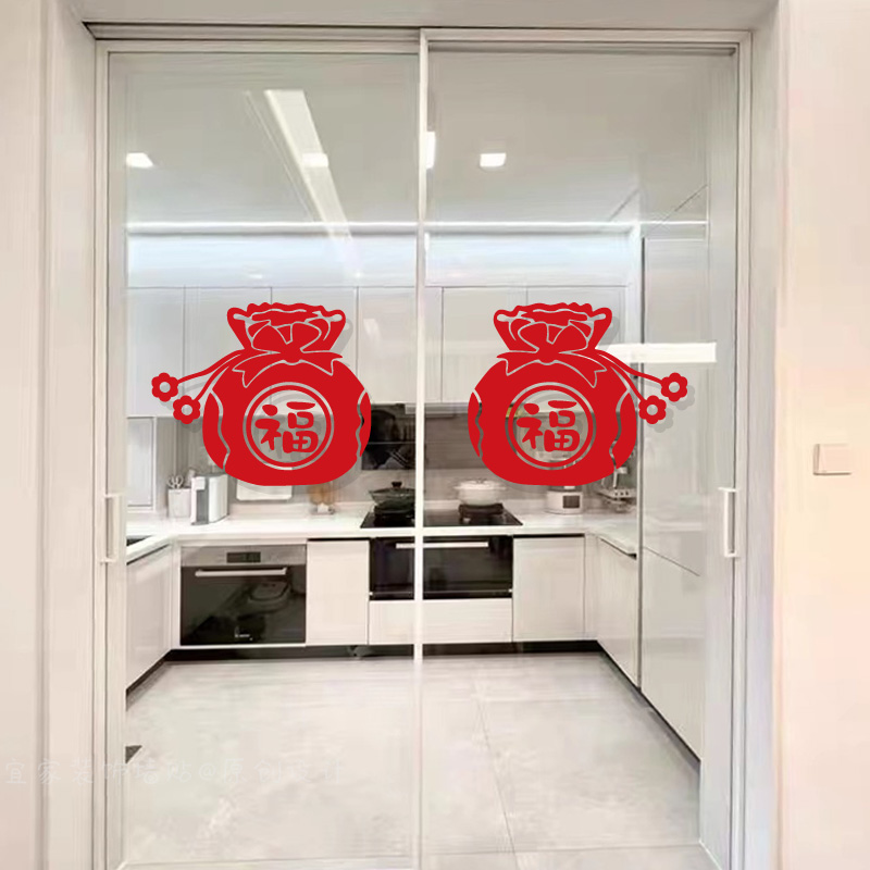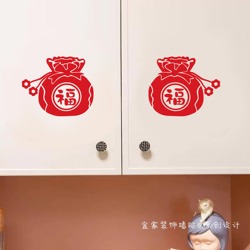 红色福袋厨房柜子门贴纸 新年喜庆橱窗玻璃装饰贴画 中式创意墙贴