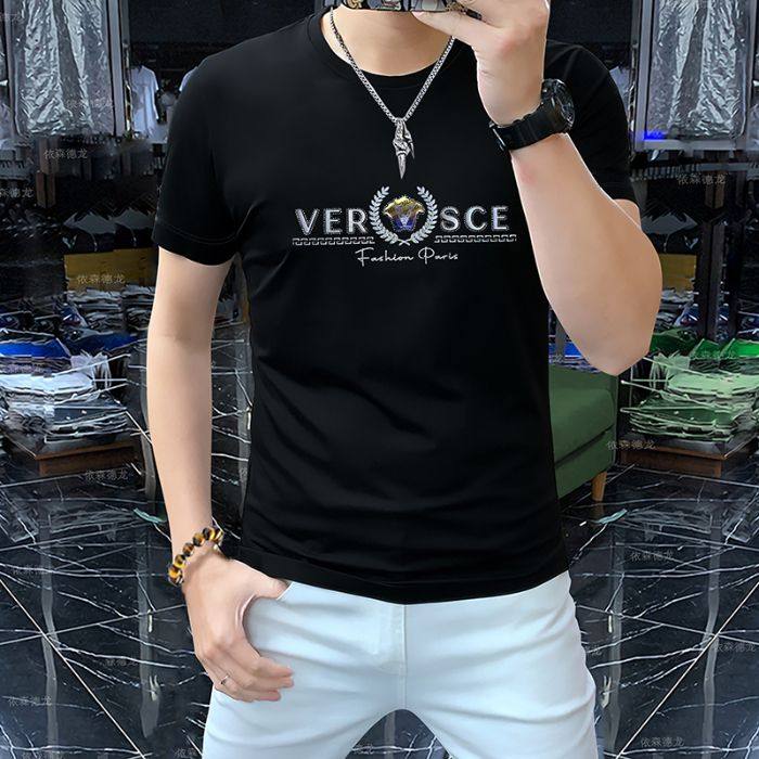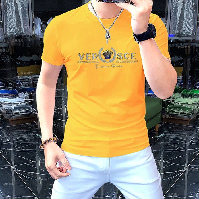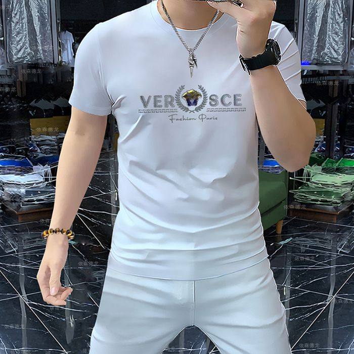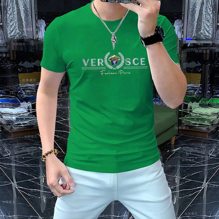 欧洲站男士短袖圆领t恤衫丝光棉男装半袖上衣立体滴胶工艺潮灰绿