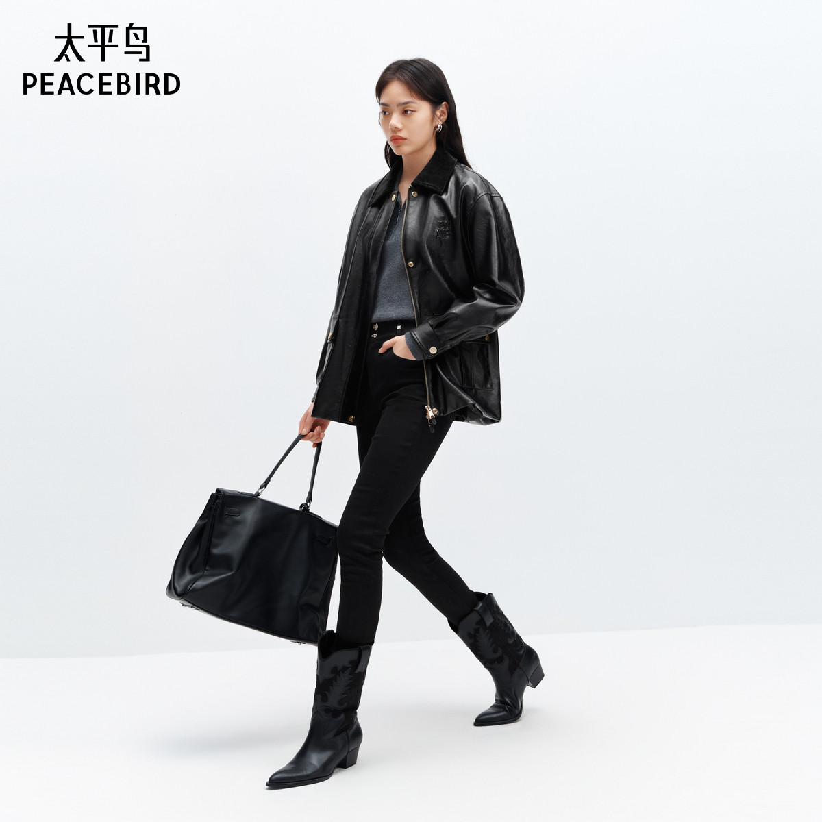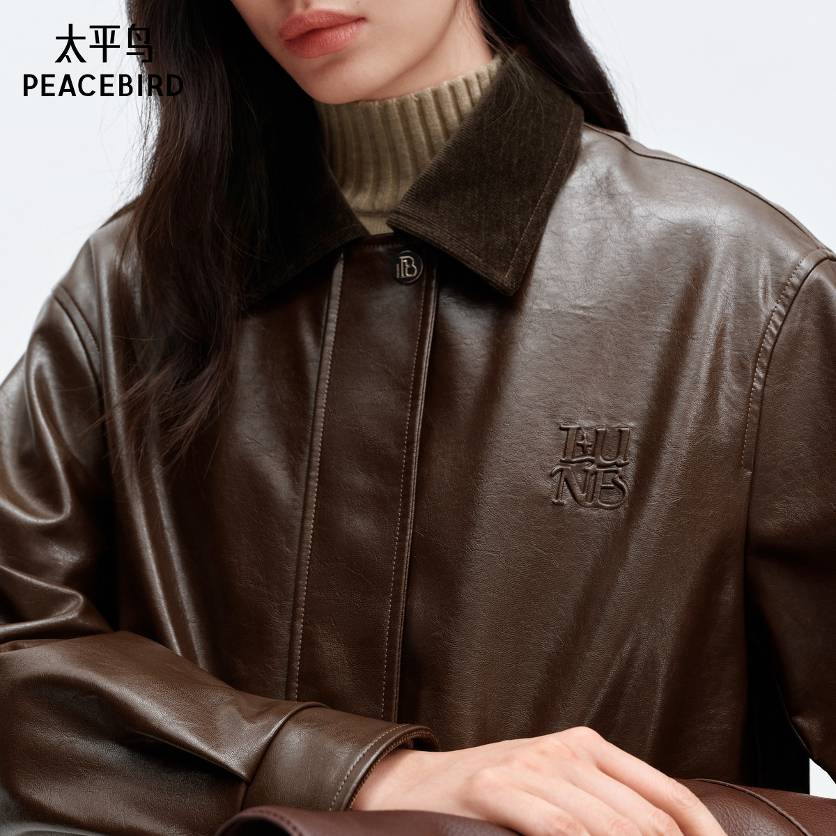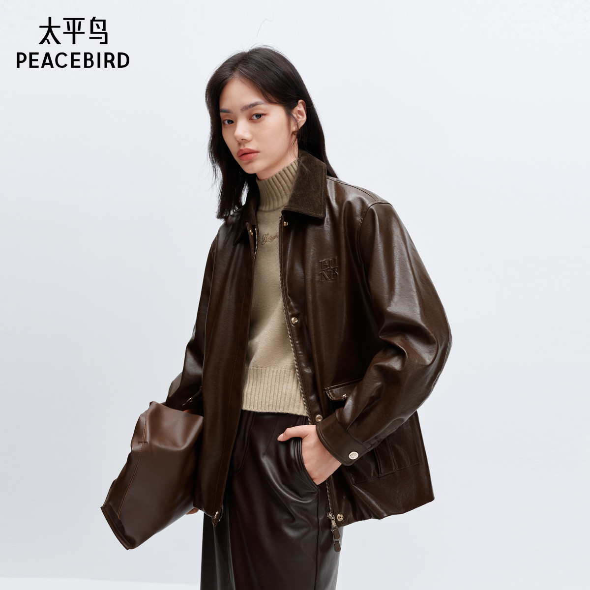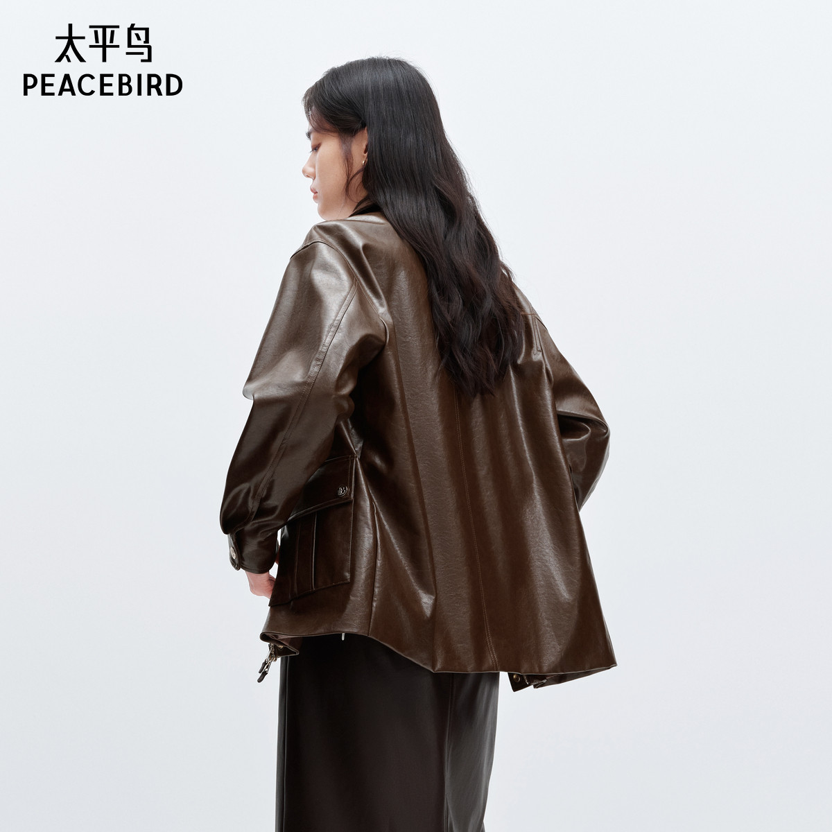太平鸟油蜡纹PU皮衣夹克外套女冬装新款黑色时尚皮衣外套女*