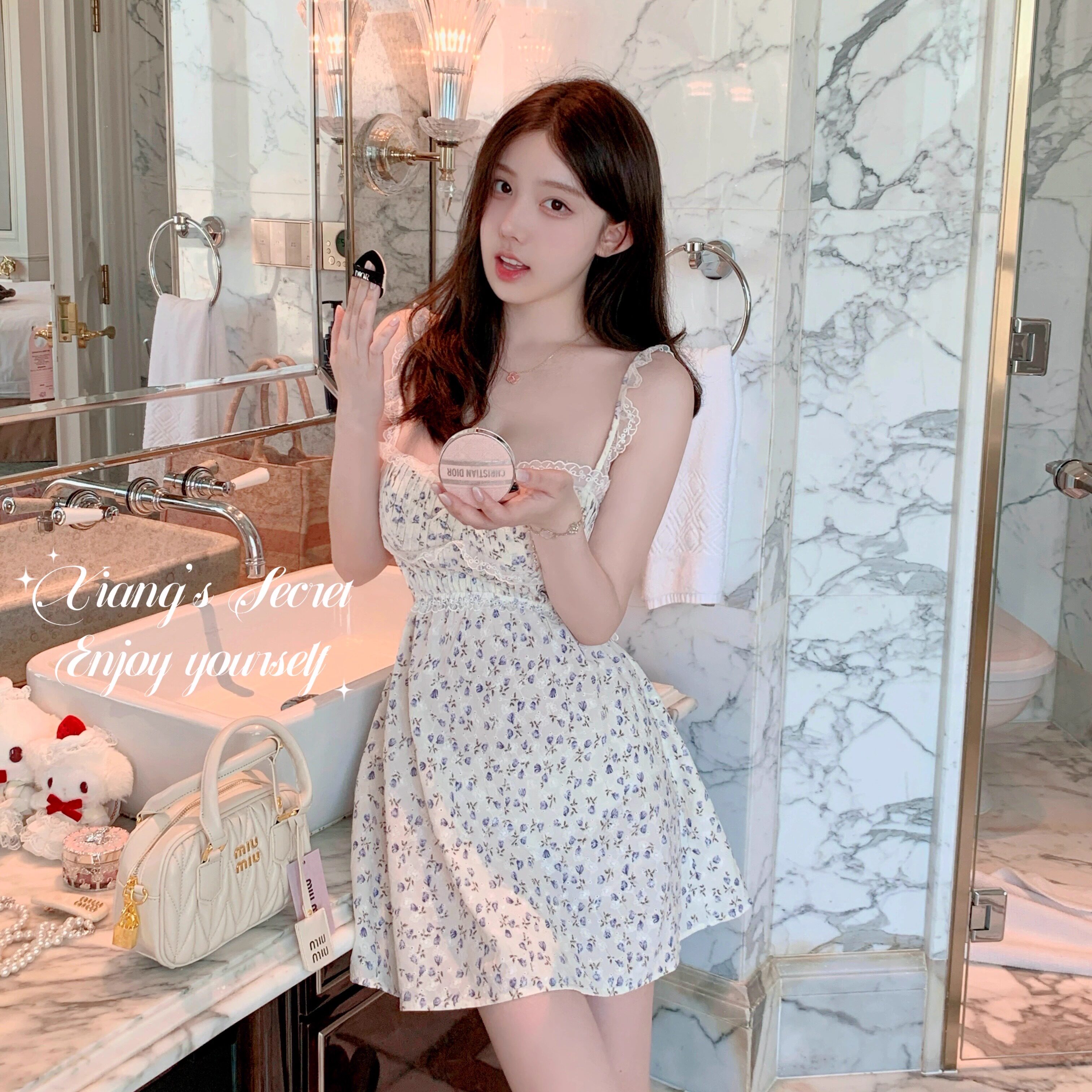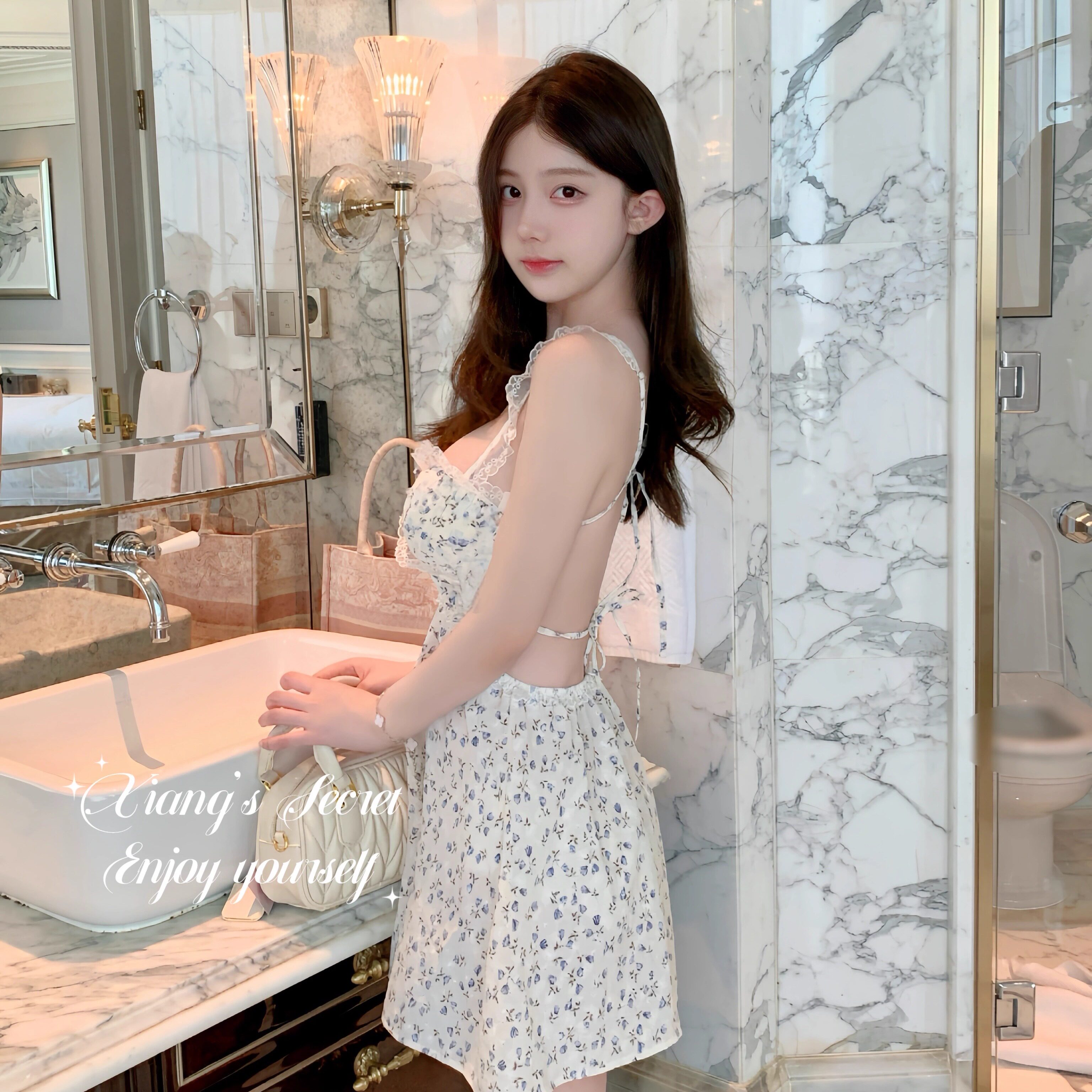 香香的秘密 浅夏薰衣草*棉麻性感小碎花露背连衣裙纯欲吊带睡裙夏