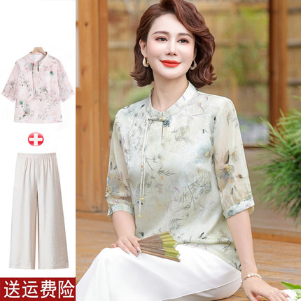 妈妈夏装短袖国风印花雪纺时尚小衫套装中老年女夏季洋气休闲上衣