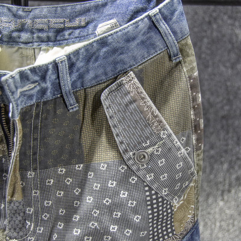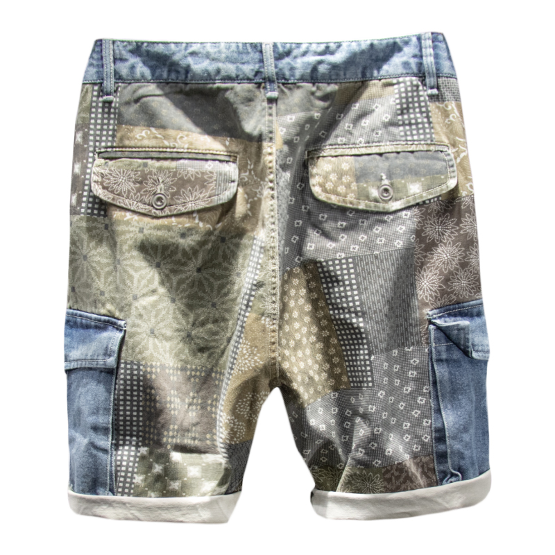 三古木棉工装牛仔短裤男夏季薄款拼接印花五分裤男休闲宽松中裤