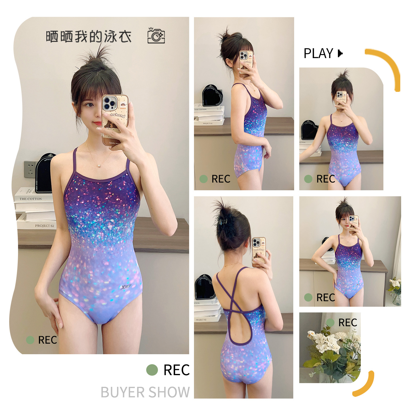 特步星光紫泳衣女2025新款专业显瘦三角竞速游泳馆专用遮肚连体装
