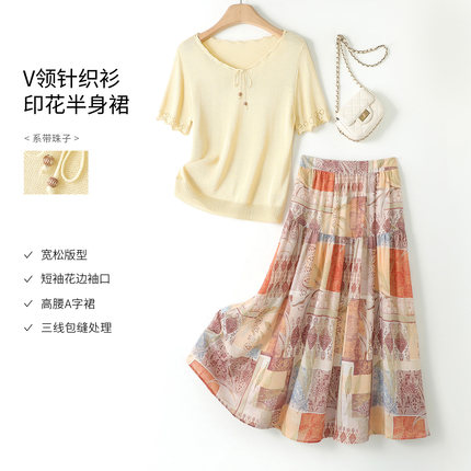 IHIMI/海谧2025夏新款时尚仿亚麻系带针织上衣松紧腰半身裙套装女