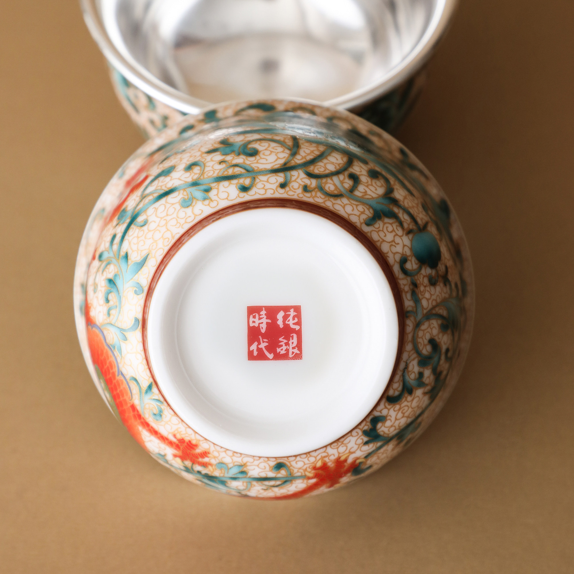 纯银时代龙凤呈祥瓷包银杯套装