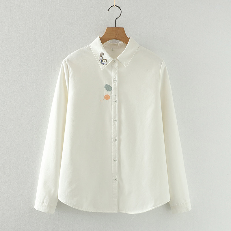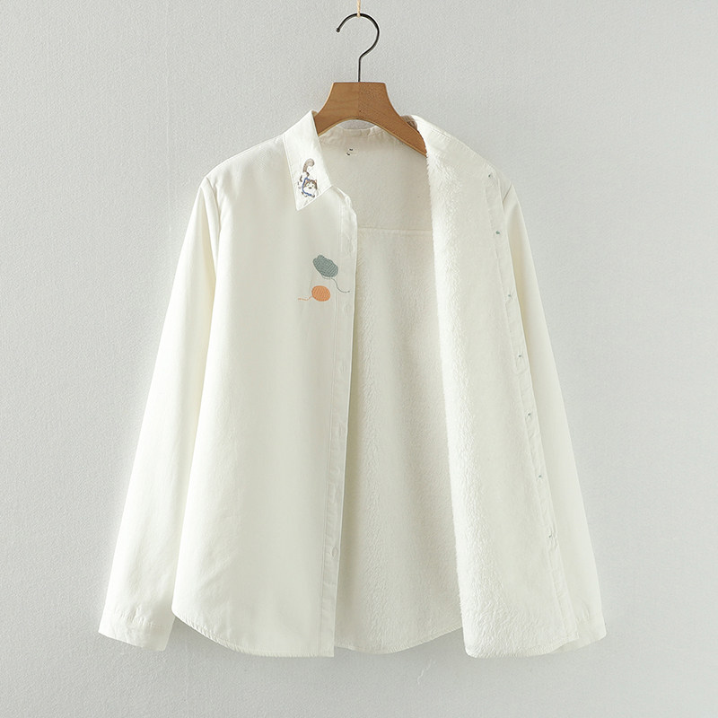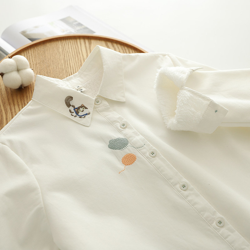 纯棉加绒加厚刺绣猫咪白衬衫女