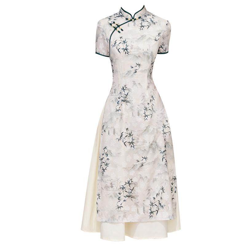改良版旗袍奥黛新式连衣裙小矮个子水墨竹叶春夏季日常女装中国风
