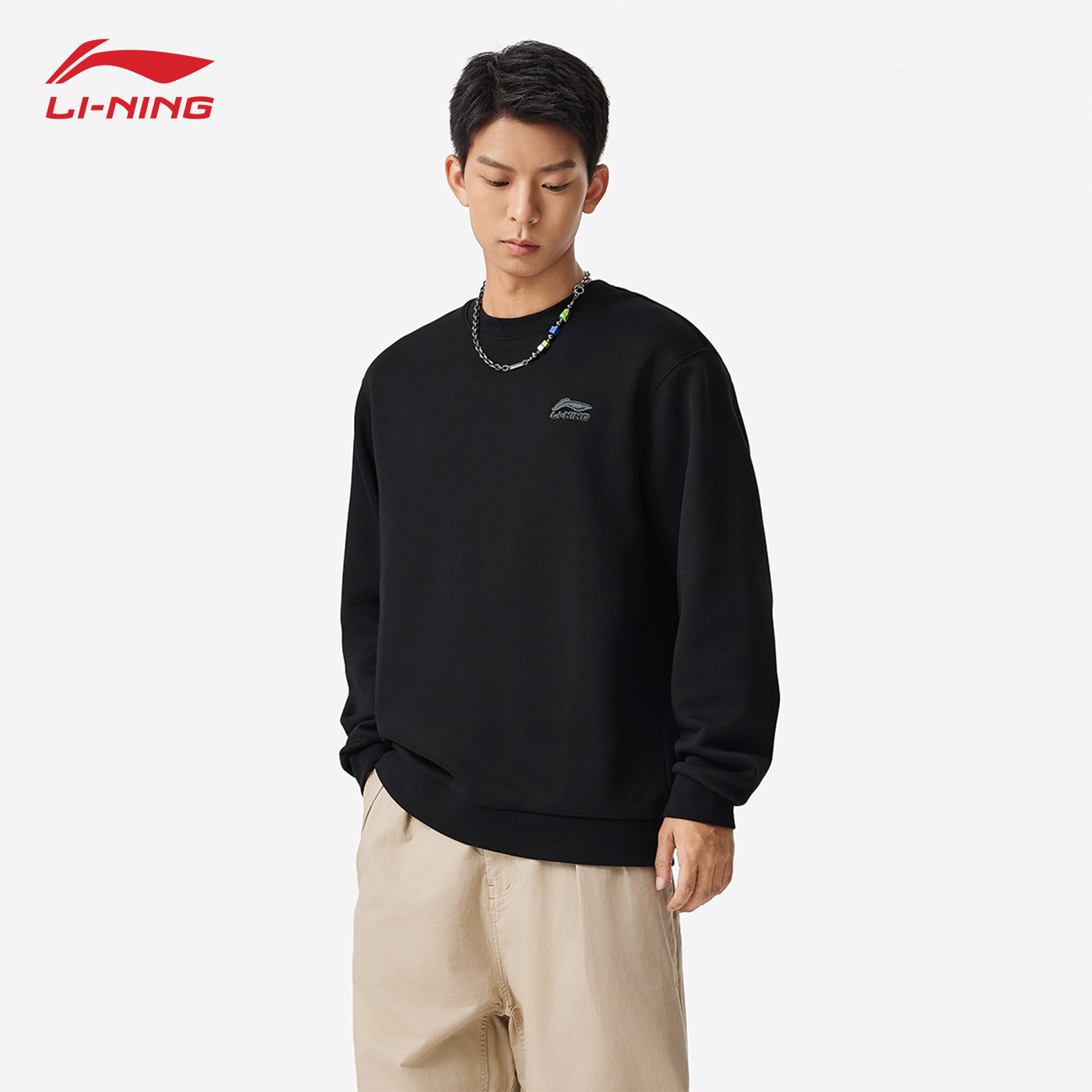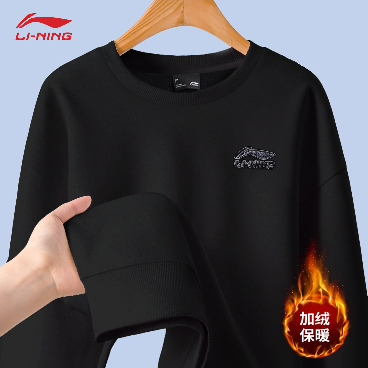 李宁黑色百搭加绒卫衣男女圆领套头百搭时尚亲肤柔软舒适情侣卫衣