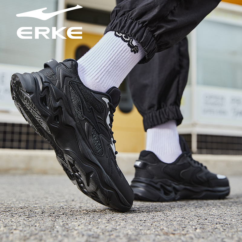 鸿星尔克男鞋2025秋季新款全黑色皮面运动鞋品牌正品黑武士跑步鞋