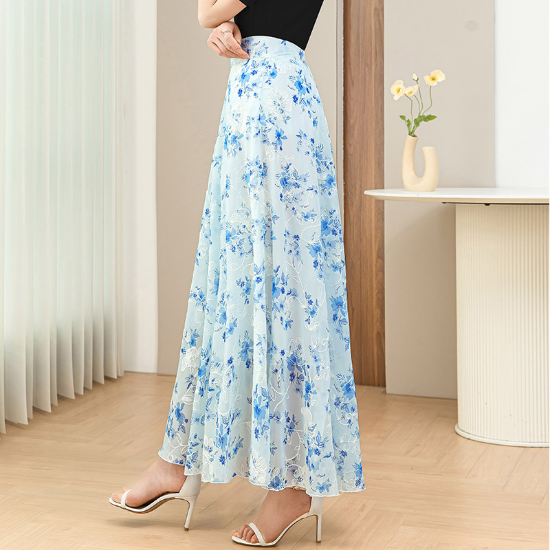 蓝色剪花雪纺半身裙长裙女夏季新款清新大码高腰A字伞裙大摆长裙