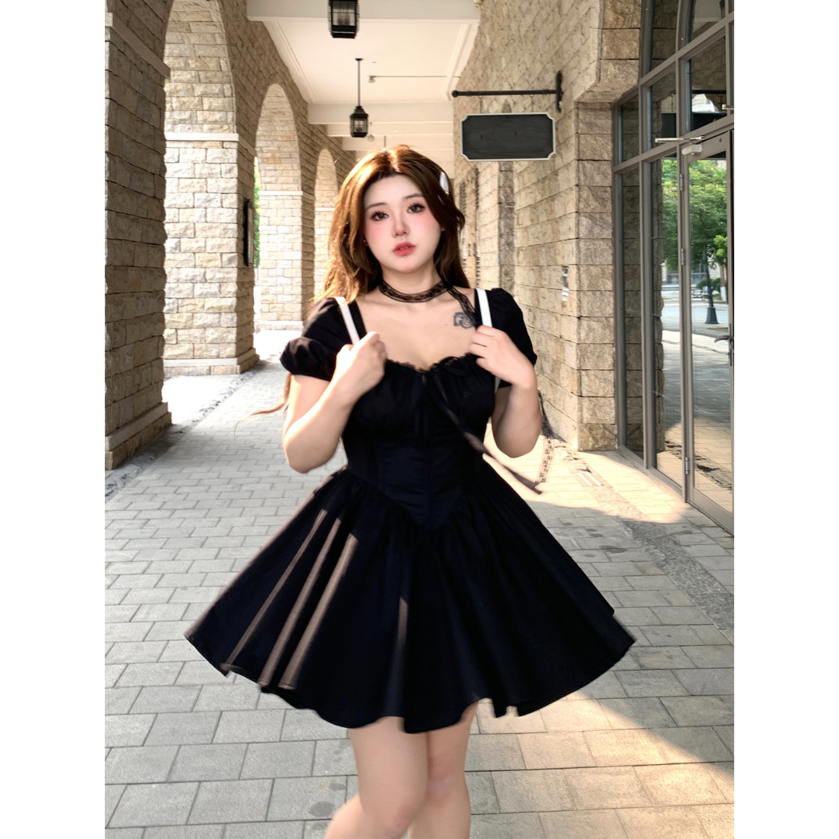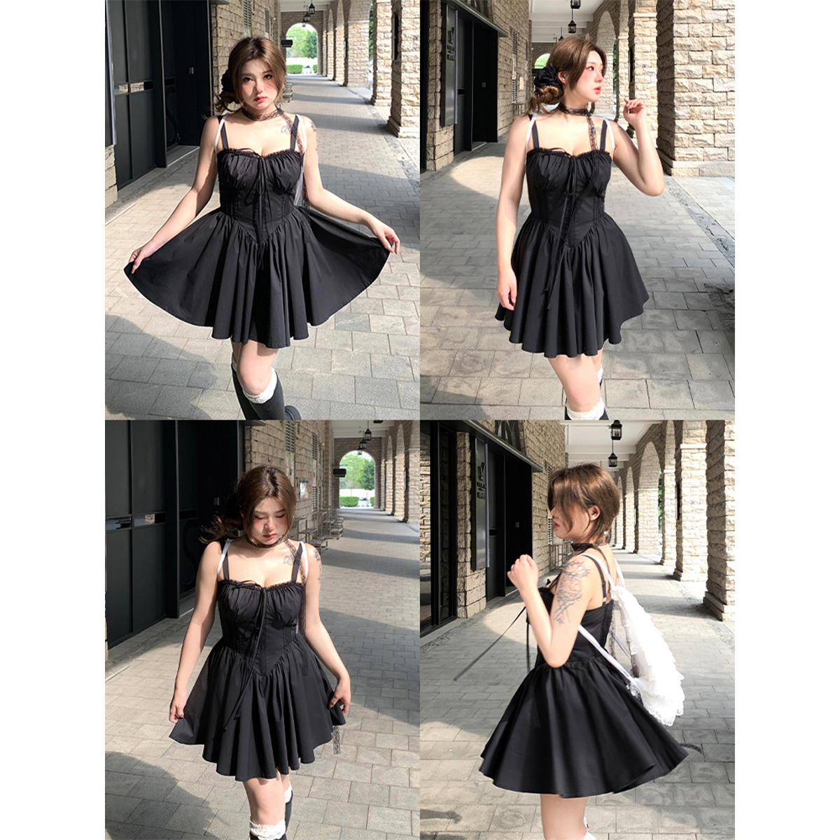 安妮不火 度假风吊带小黑裙女收腰2024夏新款微胖大码显瘦连衣裙