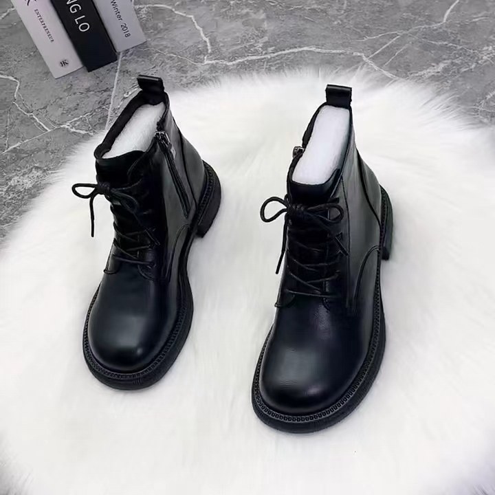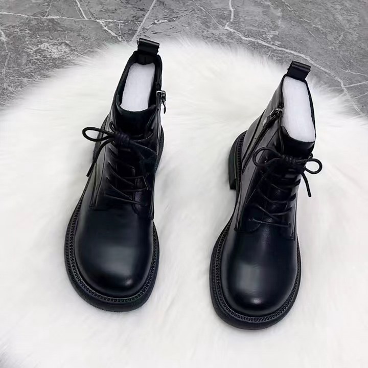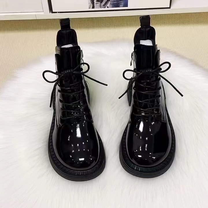 真皮马丁靴女2025秋冬新款漆皮时尚百搭平底单靴复古系带加绒短靴