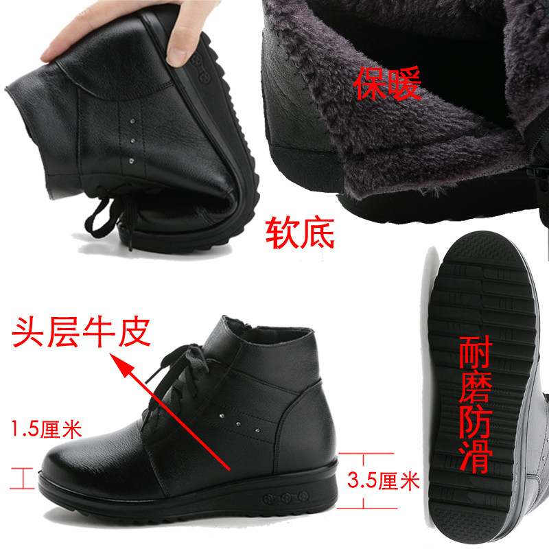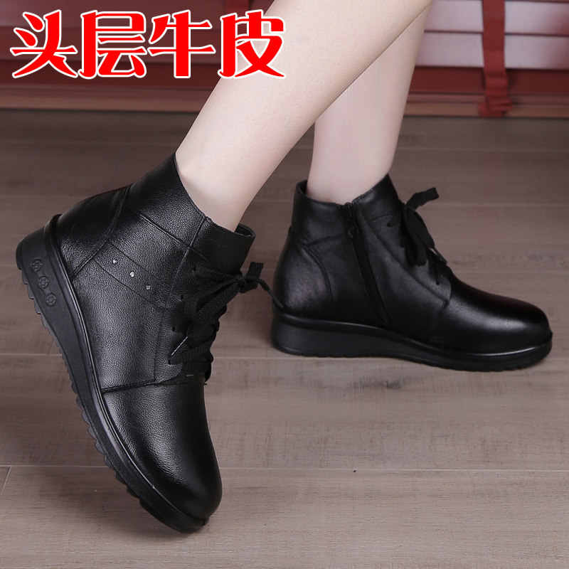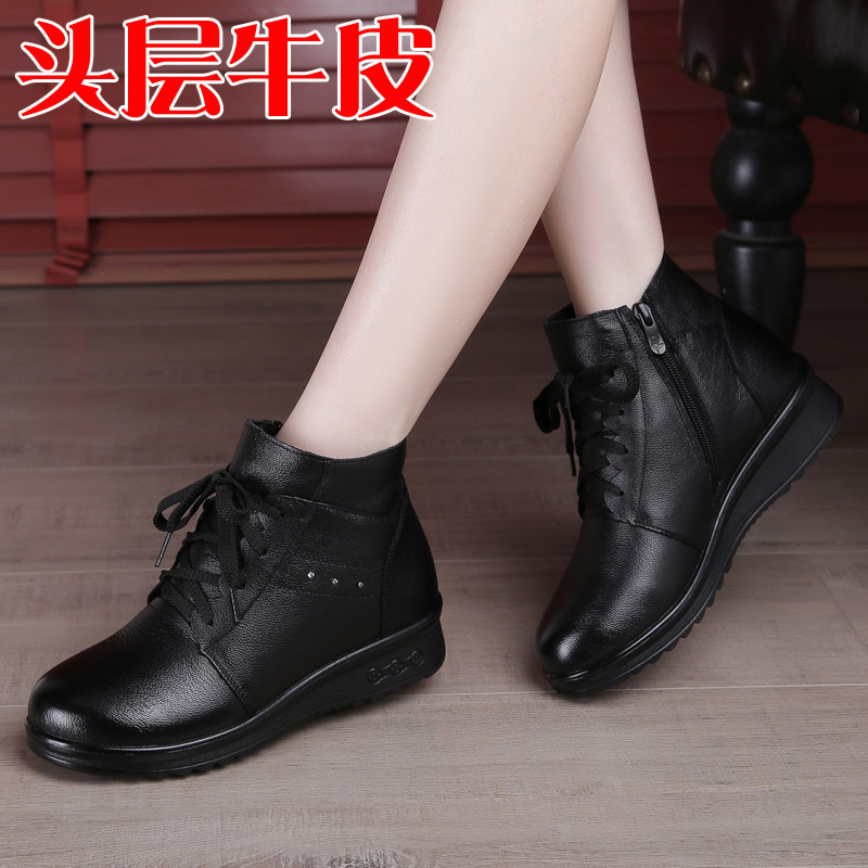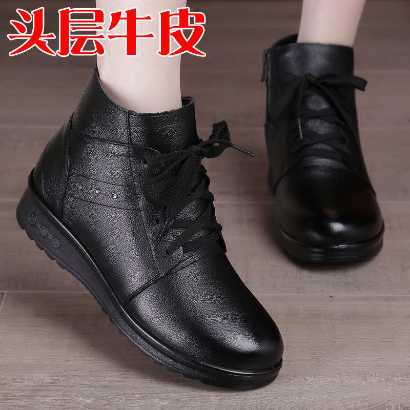 冬新款女靴平底真皮软底短靴系带女鞋中老年妈妈鞋子棉靴牛皮靴子