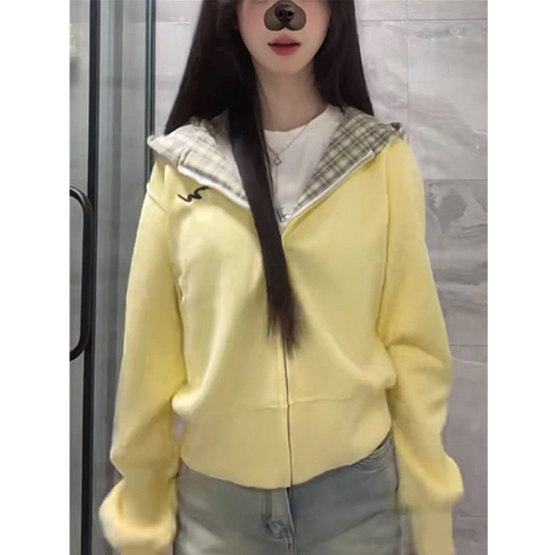 美式复古奶黄色格子拼接连帽卫衣女春秋薄款外套宽松开衫短款上衣