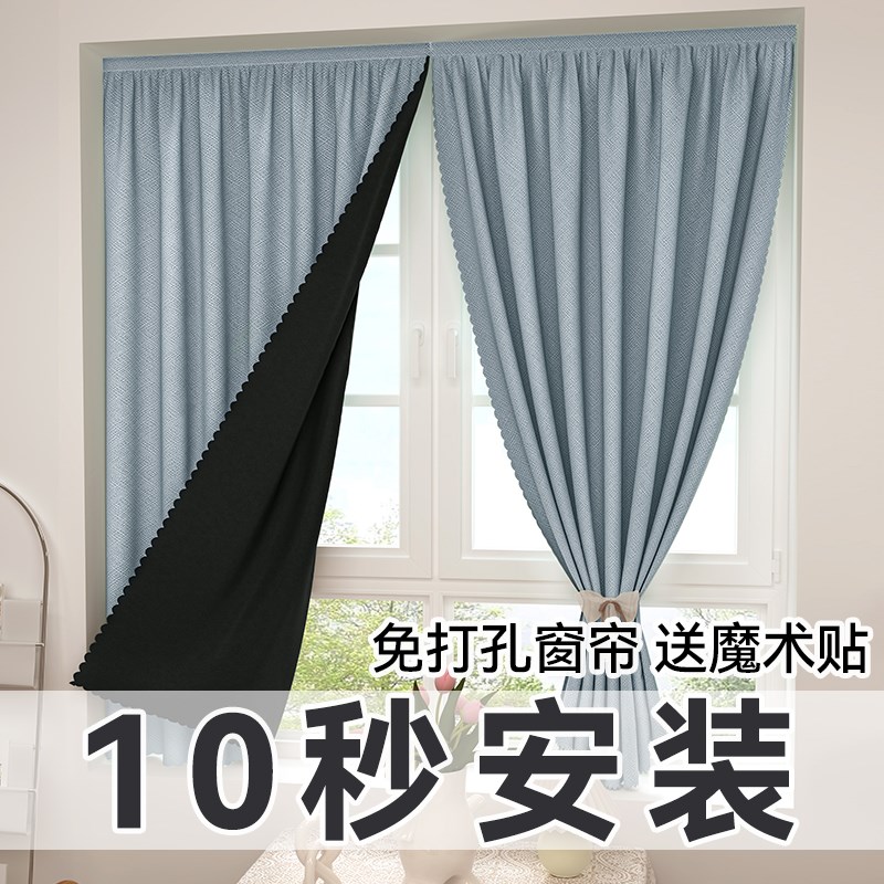 速发全遮光亚麻魔术贴窗帘免打孔安装2024新款房卧室飘窗遮挡帘全