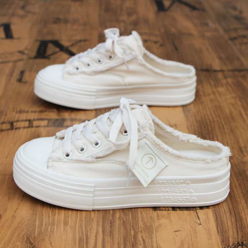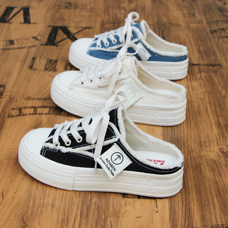 人本帆布鞋女2025秋季薄款透气半拖鞋板鞋百搭厚底懒人一脚蹬女鞋