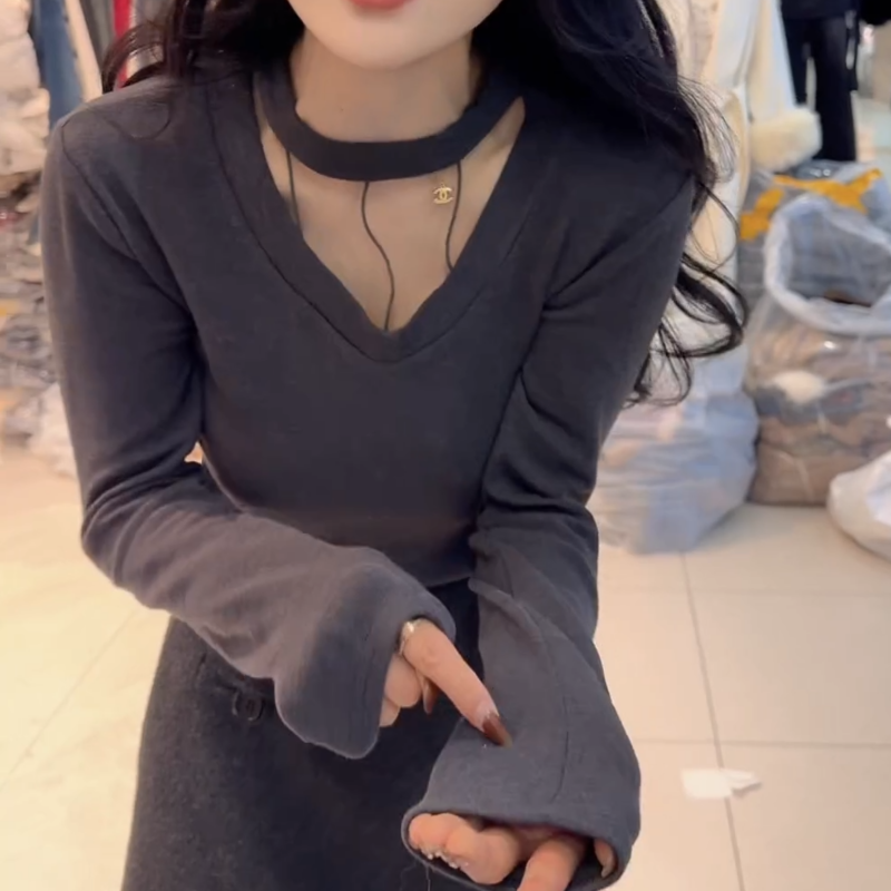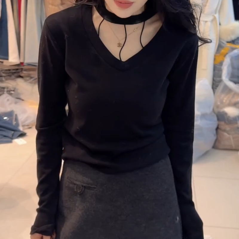 小心机网纱拼接V领长袖T恤女辣妹