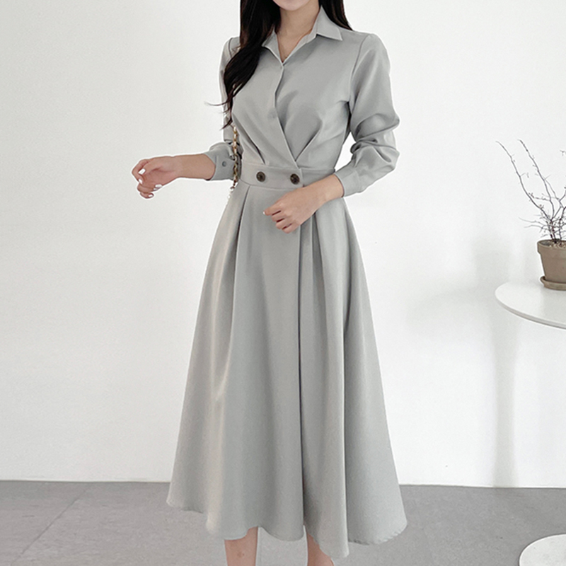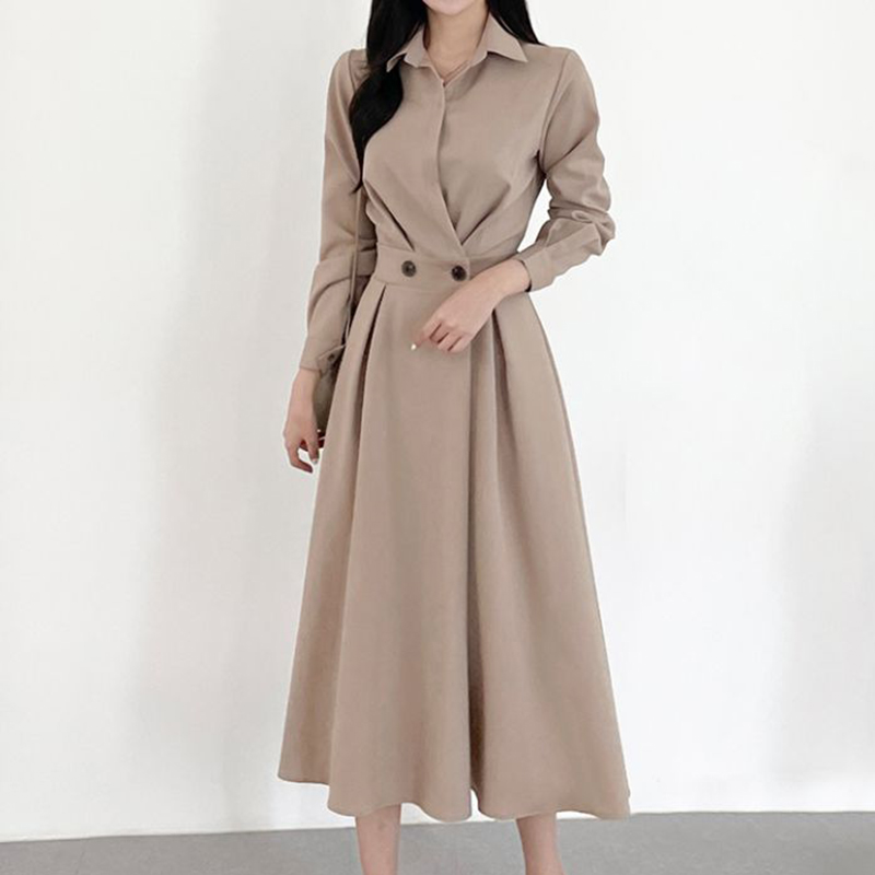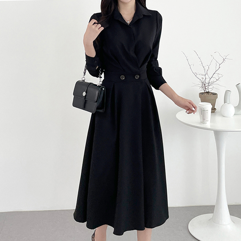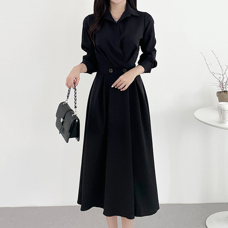 韩国chic极简主义 气质翻领两粒扣收腰显瘦纯色长袖中长款连衣裙
