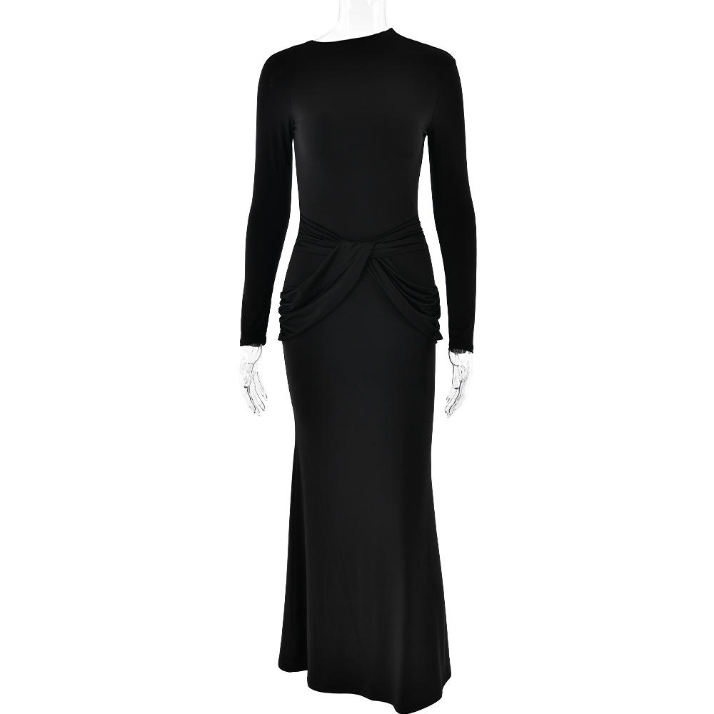 欧美2024秋季时尚包臀圆领缩褶长裙气质优雅修身长袖连衣裙单件