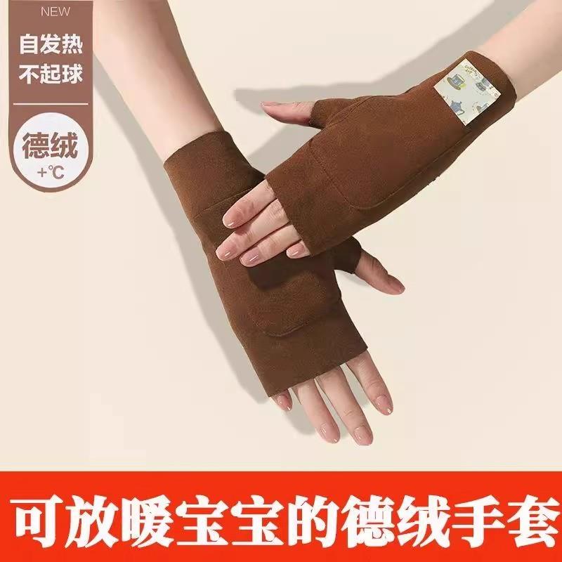 新款双兜手套德绒半指口袋设计加绒保暖可放暖贴学生写字防冻伤手