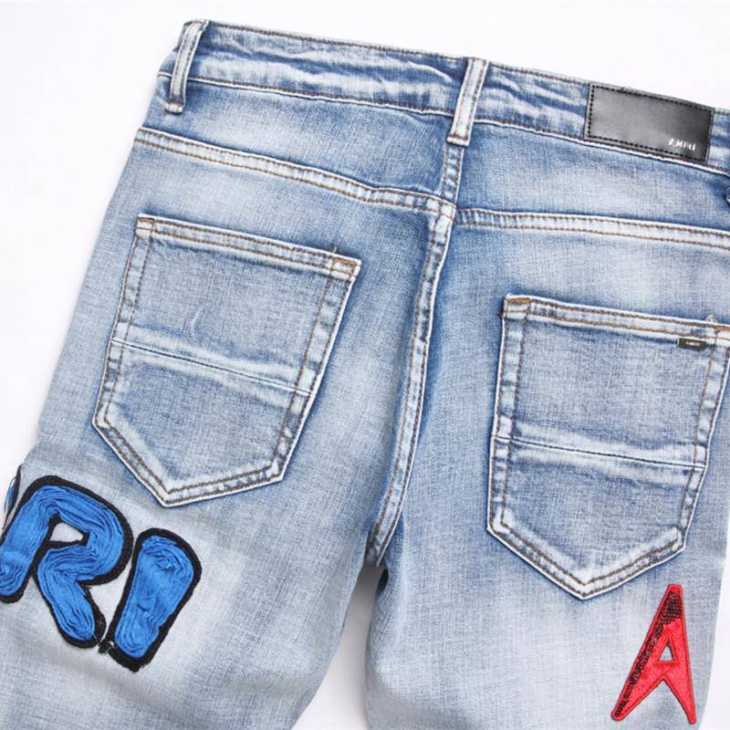 美式高端青少年轻奢破洞牛仔裤男款修身小脚裤弹力贴布休闲长裤子