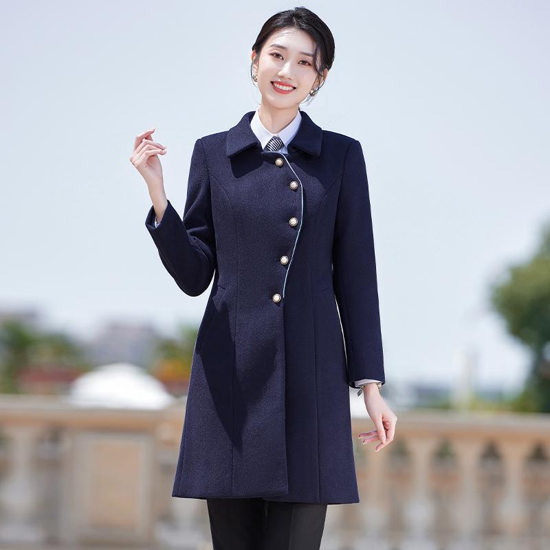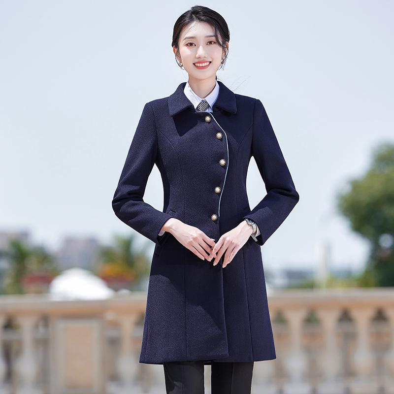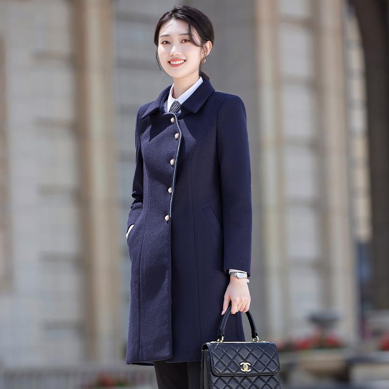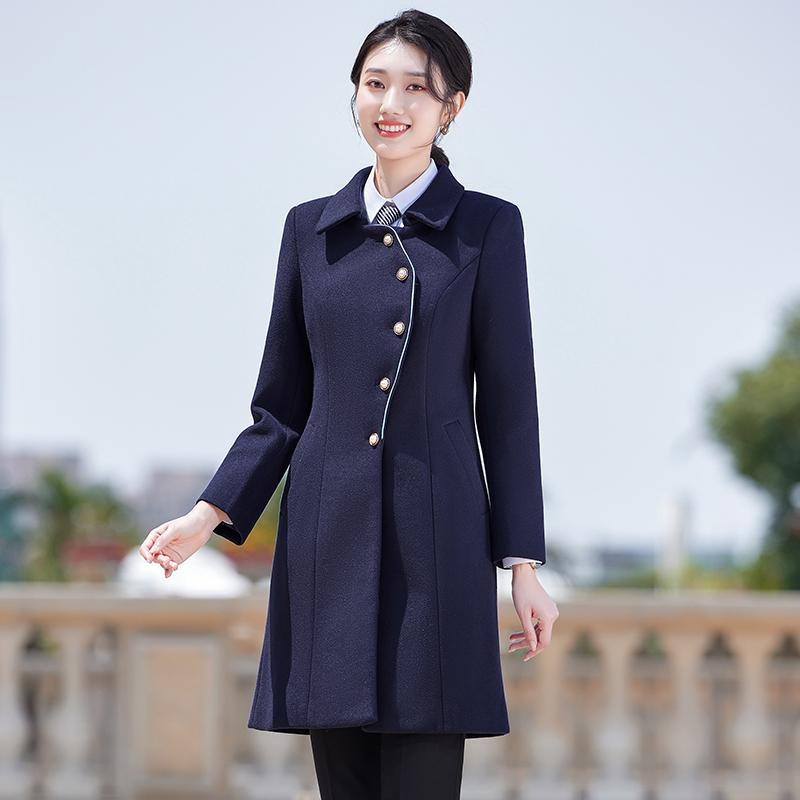 藏青色毛呢大衣女秋冬2024新款高端酒店工作服中长款加厚呢子外套