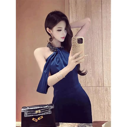 法式蓝色重工挂脖连衣裙女夏季名媛千金修身气质收腰包臀生日裙子