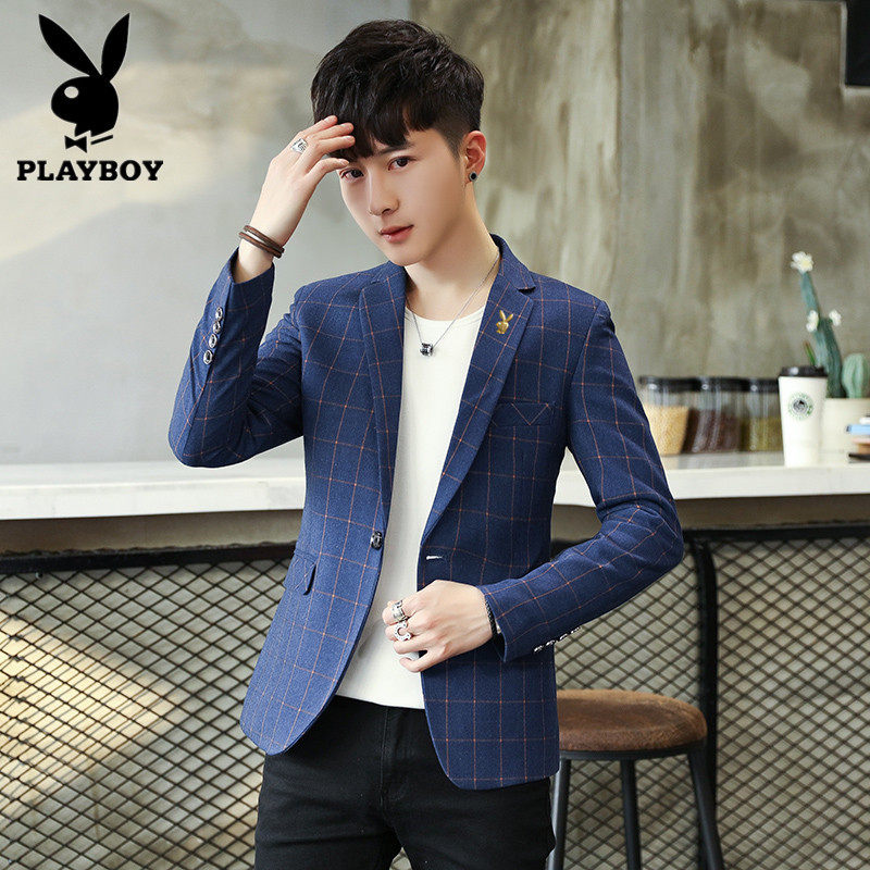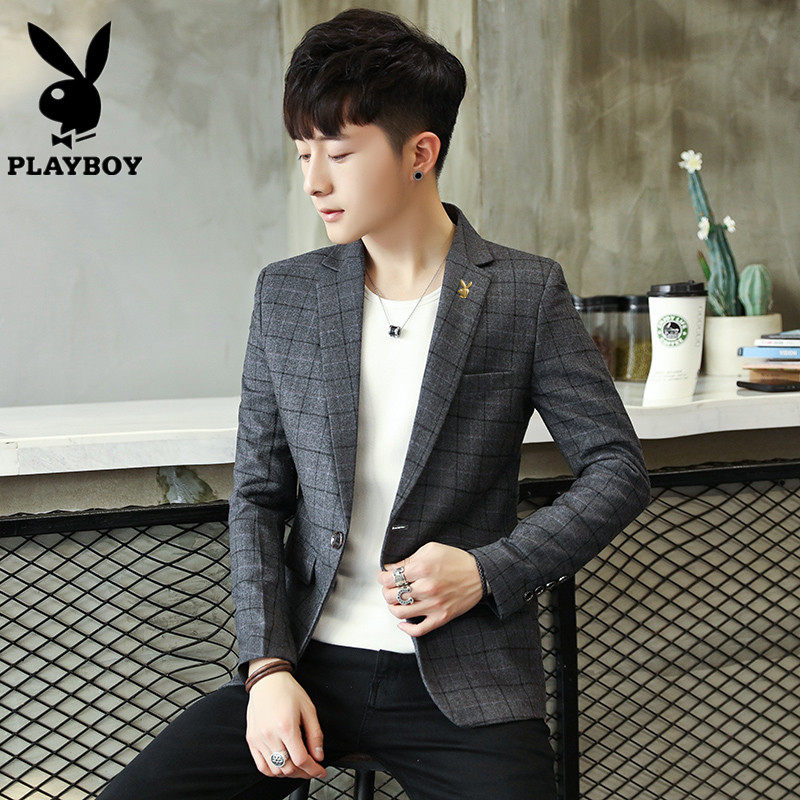 花花公子西装外套男修身格子西服