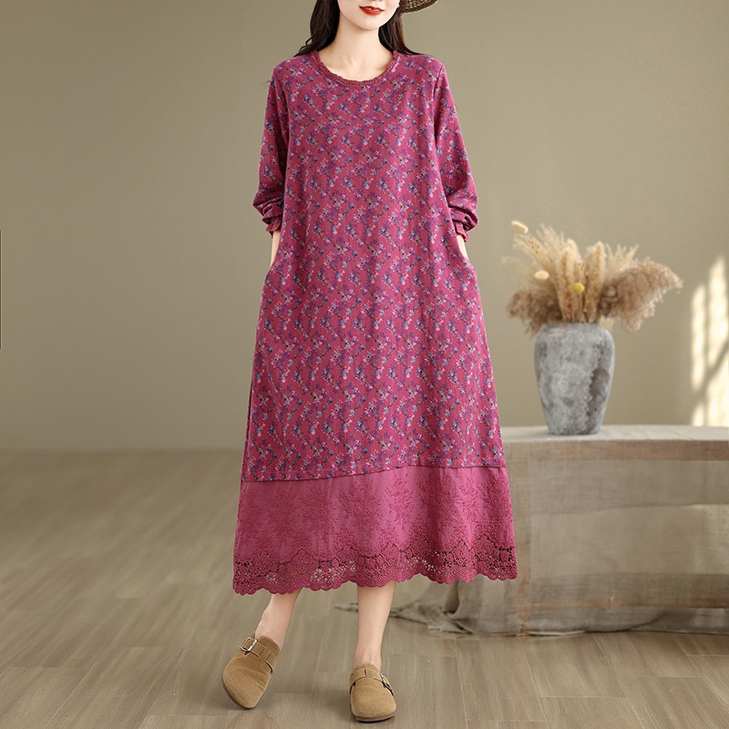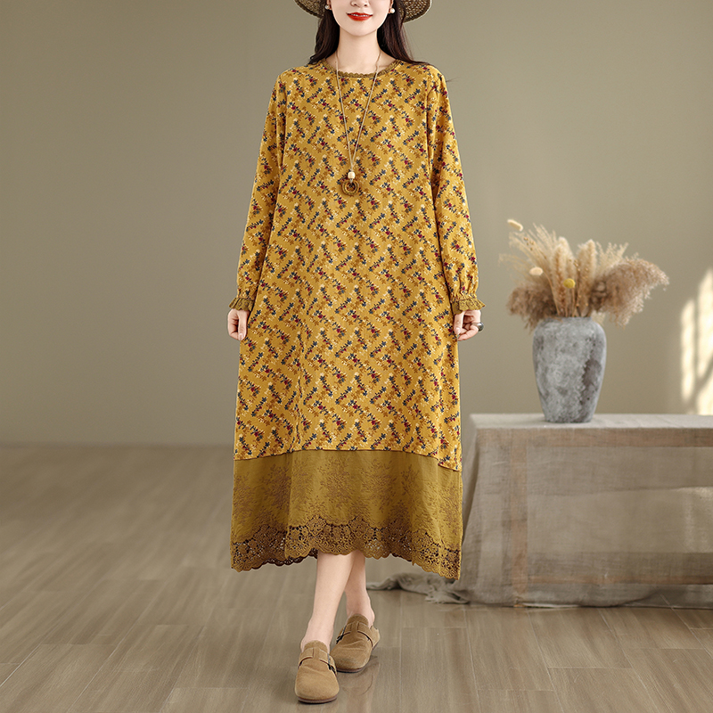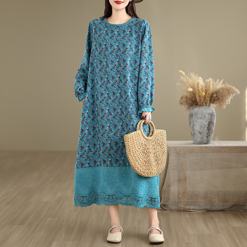 秋季新款文艺复古棉麻印花长袖圆领连衣裙女宽松显瘦系带A字裙女
