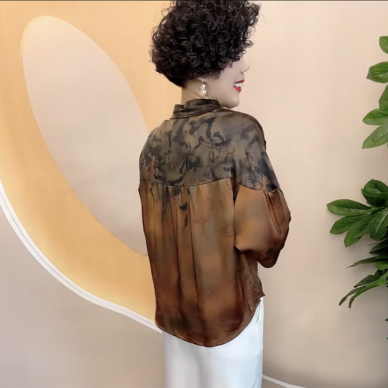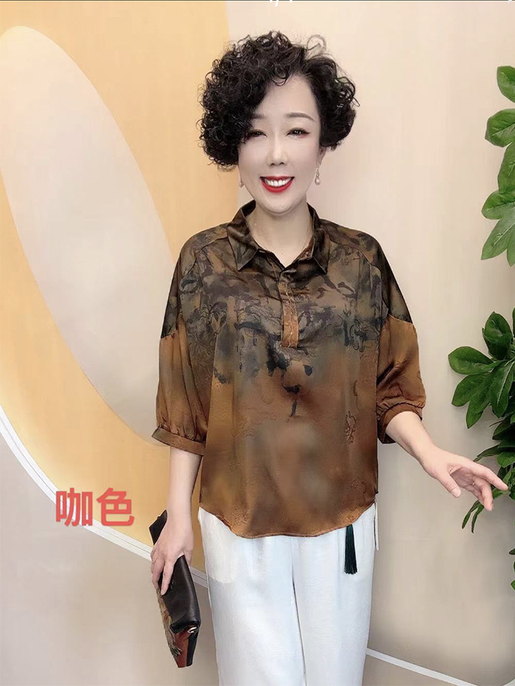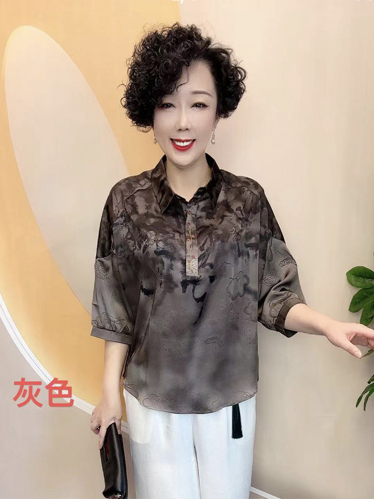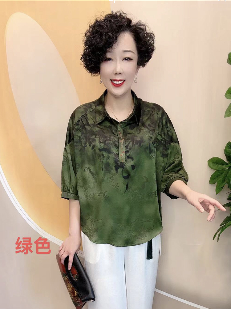 贵夫人蝙蝠袖小衫夏季中老年真丝上衣新国风暗纹提花老年人衬衫女